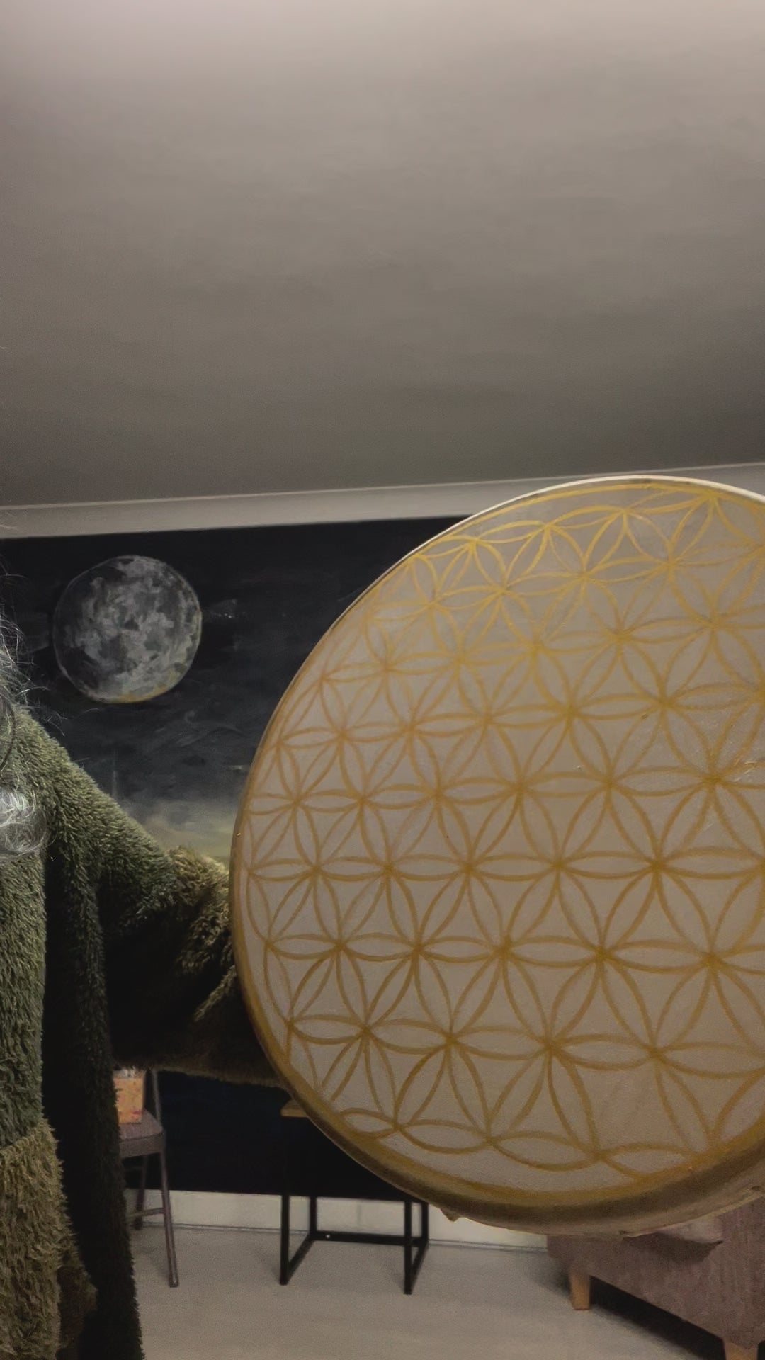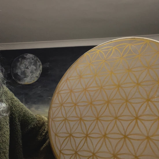 This 18 inch, Goat skinned shamanic drum, comes complete with a beater. Whether drumming for pleasure, shamanic journeying tor for use in a ritual ceremony, this drum will connect with your heartbeat and produce the most beautiful sound, with a wide range and deep tonal qualities. Comes complete with bag. Painted ethereal geometric design.