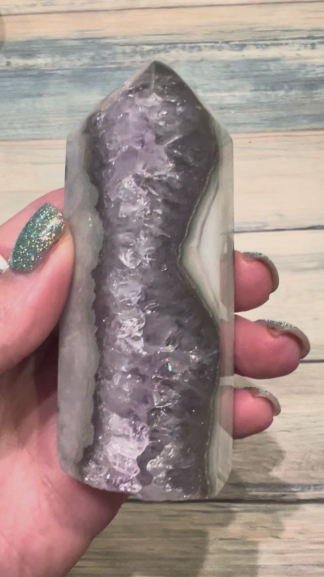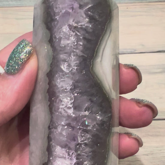 The combination of moss agate and amethyst creates a harmonious balance between the grounding energy of moss agate and the calming, spiritual qualities of amethyst. This pairing can be particularly beneficial for those seeking emotional stability, stress relief, and a deeper connection to the divine. Height 9cm, width 4cm