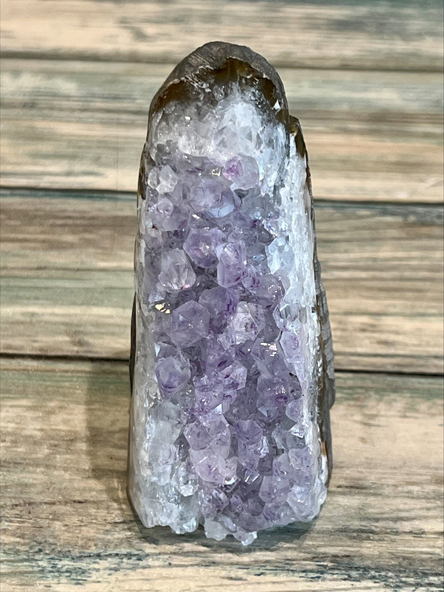 In addition, amethyst's unique metaphysical abilities are said to calm the mind and inspire a rejuvenating meditative state. Amethyst activates the third eye, crown, and etheric chakras, boosting cognitive perception, intuition, and feelings of connectedness with the universe. Approximately 8cm height, 4cm depth