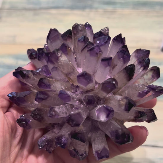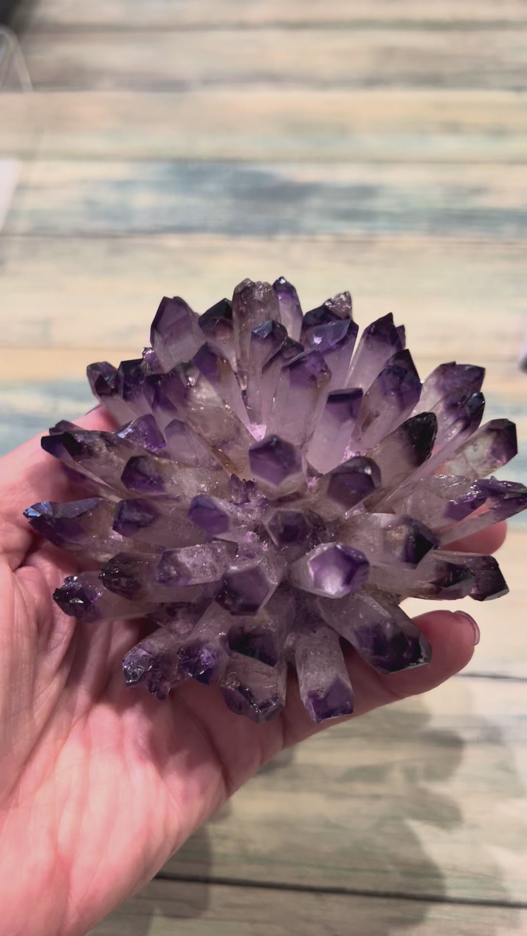 Lab-grown (or synthetic) amethyst is identical in chemical and physical properties to natural amethyst, but it's created in a lab using the hydrothermal process, which involves growing crystals in a high-pressure autoclave. While it mimics natural amethyst's appearance, it can sometimes have fewer inclusions or be more flawless due to the controlled lab environment. Weight 395g