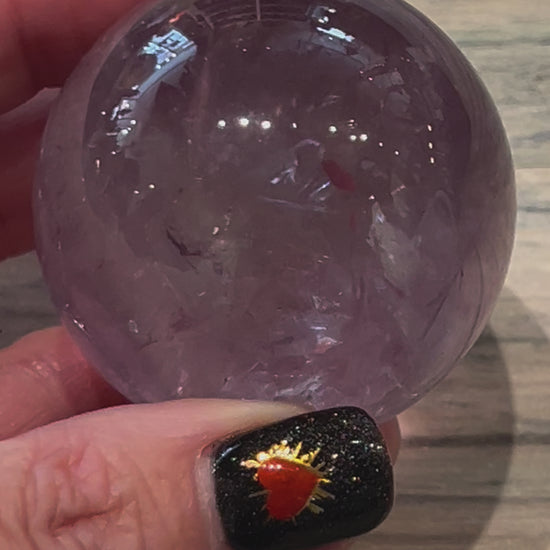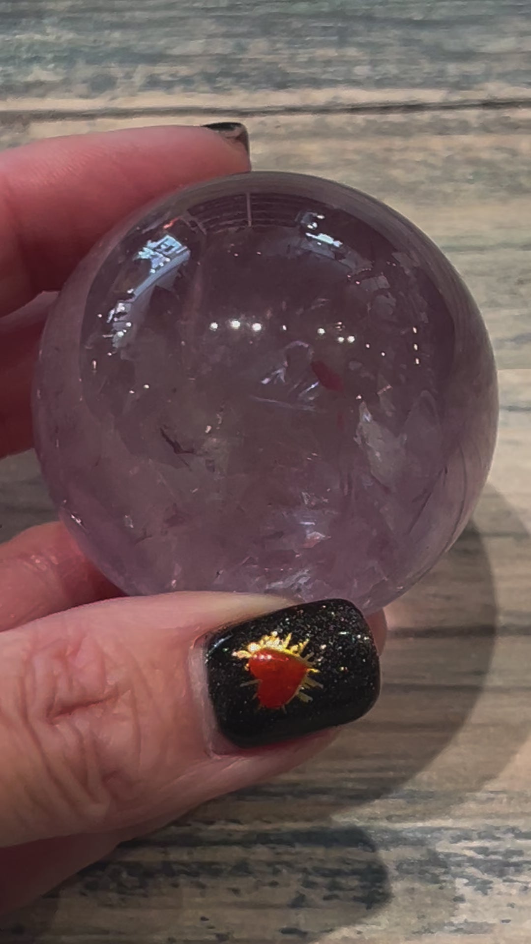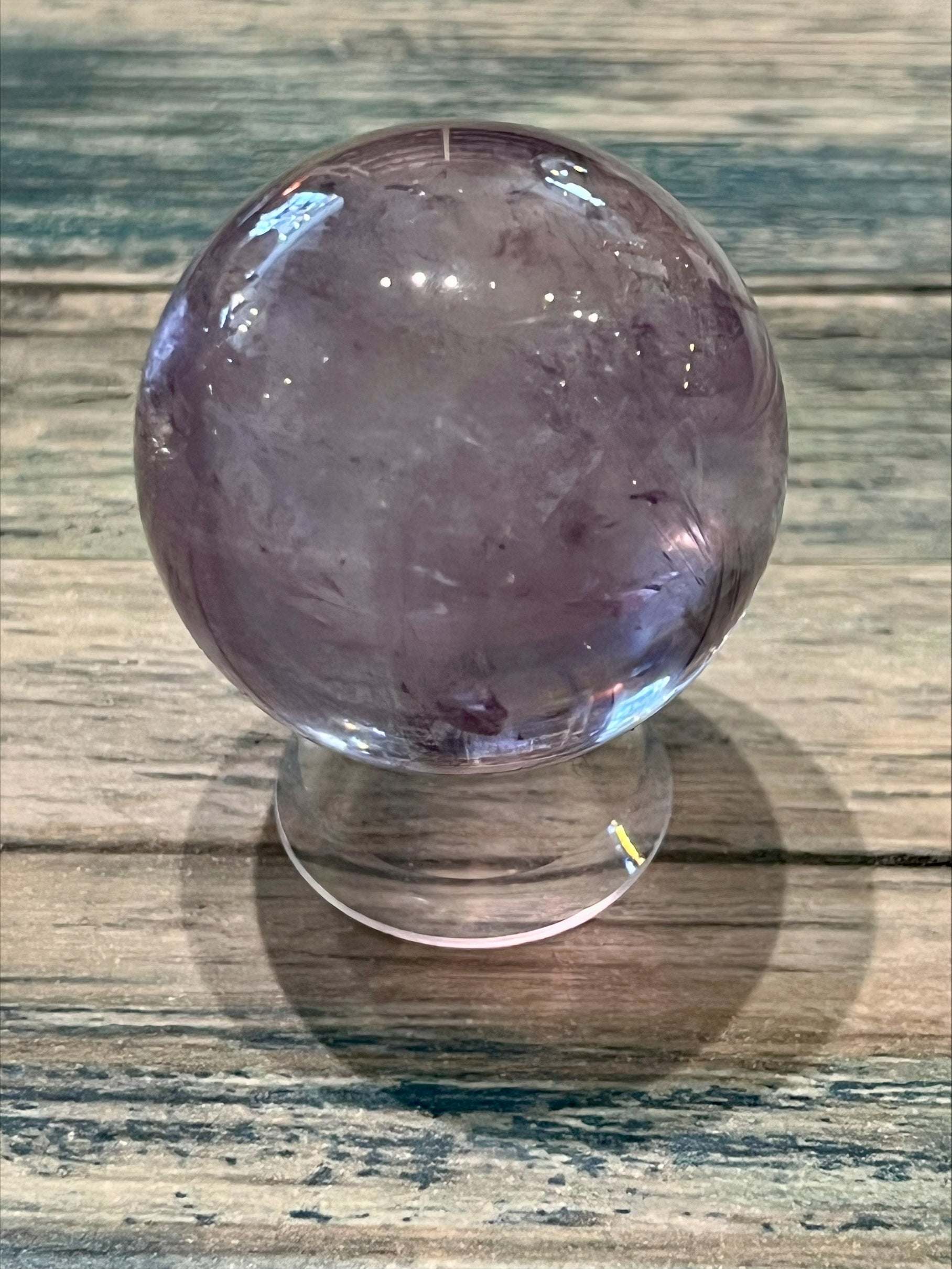 This beautiful Amethyst Sphere brings powerful healing and clearing properties. It helps to bring calm and balance to wherever it is needed. Associated with wisdom and seveurinty. Comes complete with its own stand and crocheted bag, created by woolpixie.com . Sphere approximately 4.5cm across