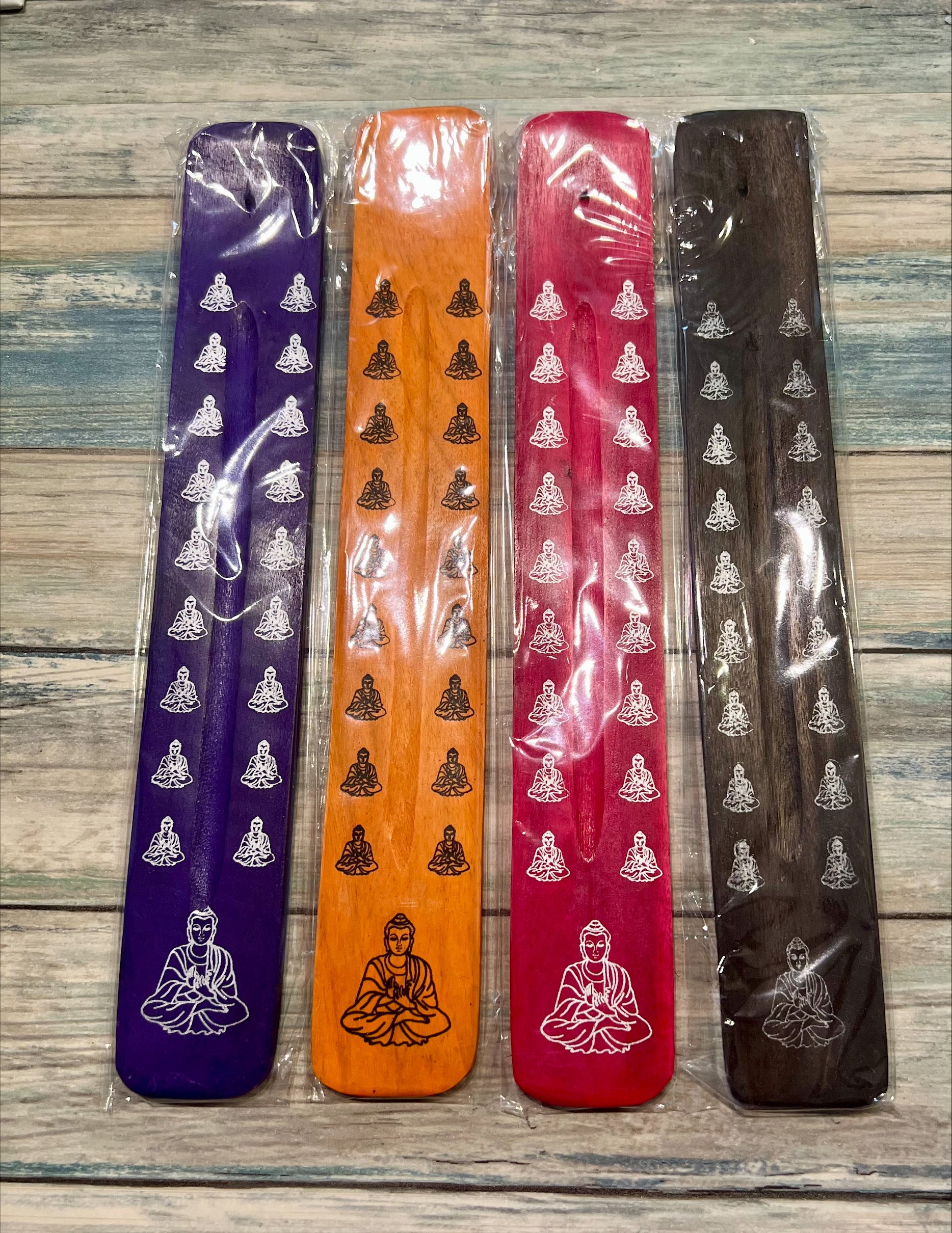 Purple wooden ashcatcher with Buddha design. 25cm by 5cm