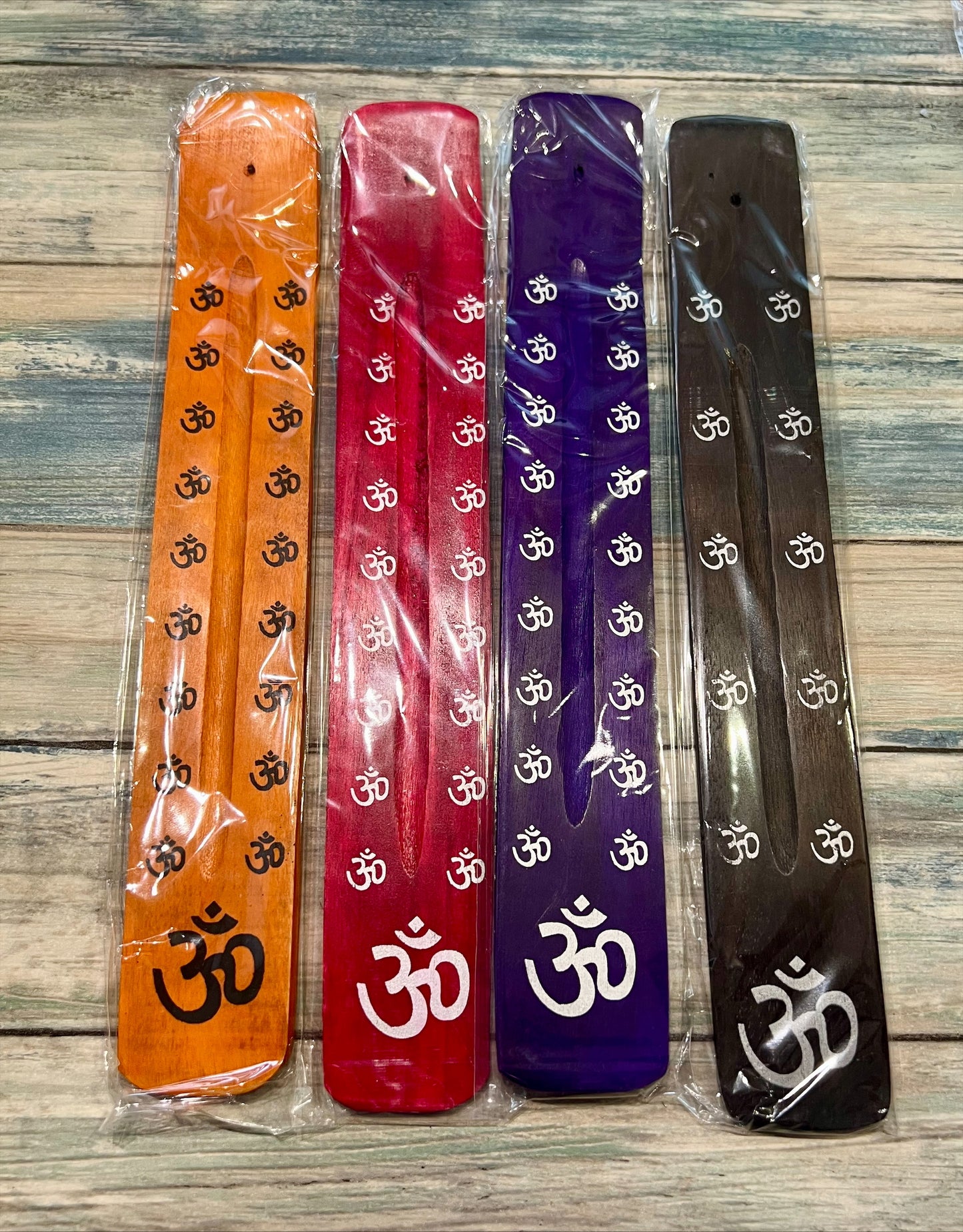 Purple wooden ashcatcher with Om design. 25cm by 5cm