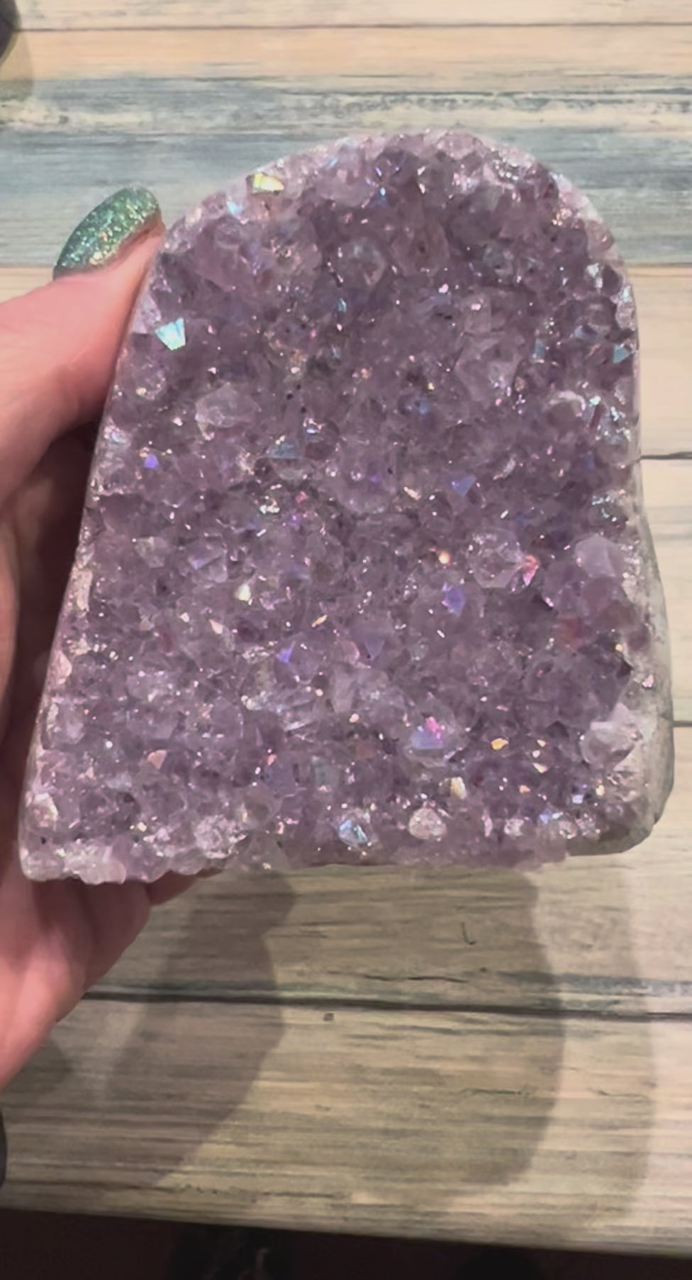 How beautiful is this aura Amethyst piece. Aura Amethyst (or Angel Aura Amethyst) spiritually means enhanced divine connection, intuition, and spiritual growth, combining natural amethyst's peace with metallic bonding's high vibration to boost the crown/third-eye chakras for calm, clarity, psychic awareness, and protection, uplifting the spirit with joy and optimism. It's used in meditation for higher consciousness, stress relief, and to balance energy fields. Measures approximately 9.5cm height, 8cm width and 6.5cm depth.