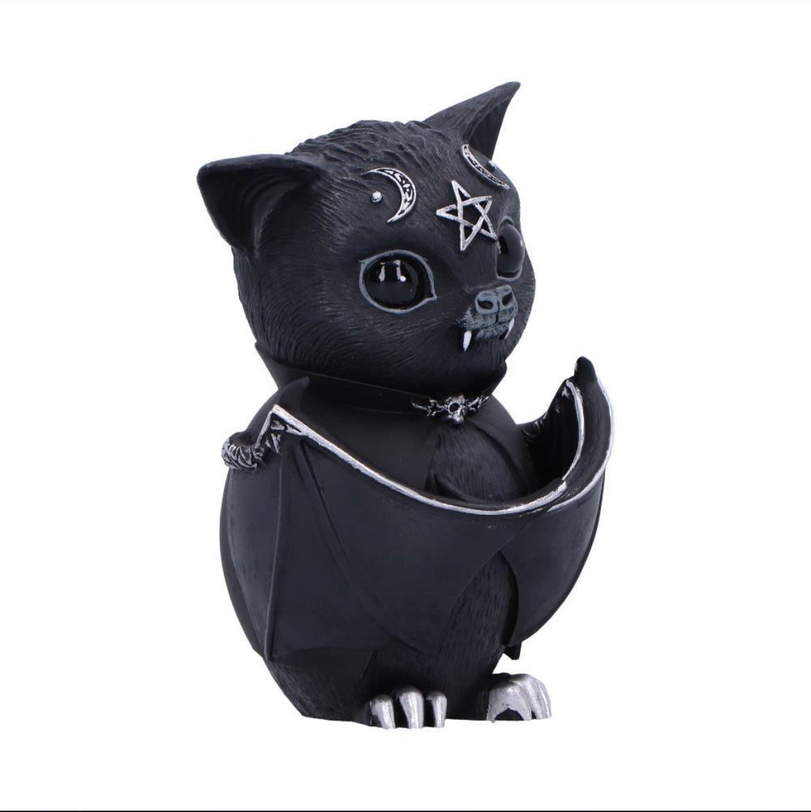This strange creature is the union of good and evil. As you look into its black eyes you notice that all is not as it seems, darkness resides within. Inside of this bat appears to be a vampire spirit, encapsulated with abnormally large fangs and a black cape. The bat is decorated in ornate silver detailing. Cast in high quality resin and carefully hand painted this figurine is likely to be the cutest occultist you've ever seen.