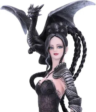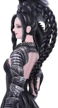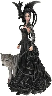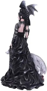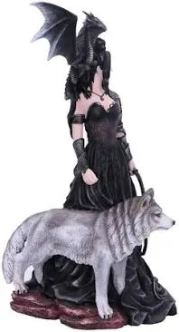 Step into the dark and enchanting world of Nene Thomas with the Bellamaestra figurine from Nemesis Now's giftware collection. The Lady of Pain, also known as Bellamaestra, is a captivating figure dressed in a stunning black ballgown. The dress features a revealing draped sweetheart neckline, adding a touch of allure to her mysterious persona. In her left hand, she holds a whip, symbolizing her power and determination to challenge the unjust. Bellamaestra is not alone in her quest for justice. Standing faithfully by her side is a majestic grey wolf, a symbol of loyalty and strength. Perched on her shoulder is a miniature black dragon, ready to unleash its fiery wrath upon anyone who dares to cross Bella's path. Every intricate detail of this figurine has been meticulously hand-painted, ensuring that each piece is a true work of art. With a height of 32.5cm, this stunning figurine is the perfect addition to any home, adding a touch of alternative enchantment to your living space.