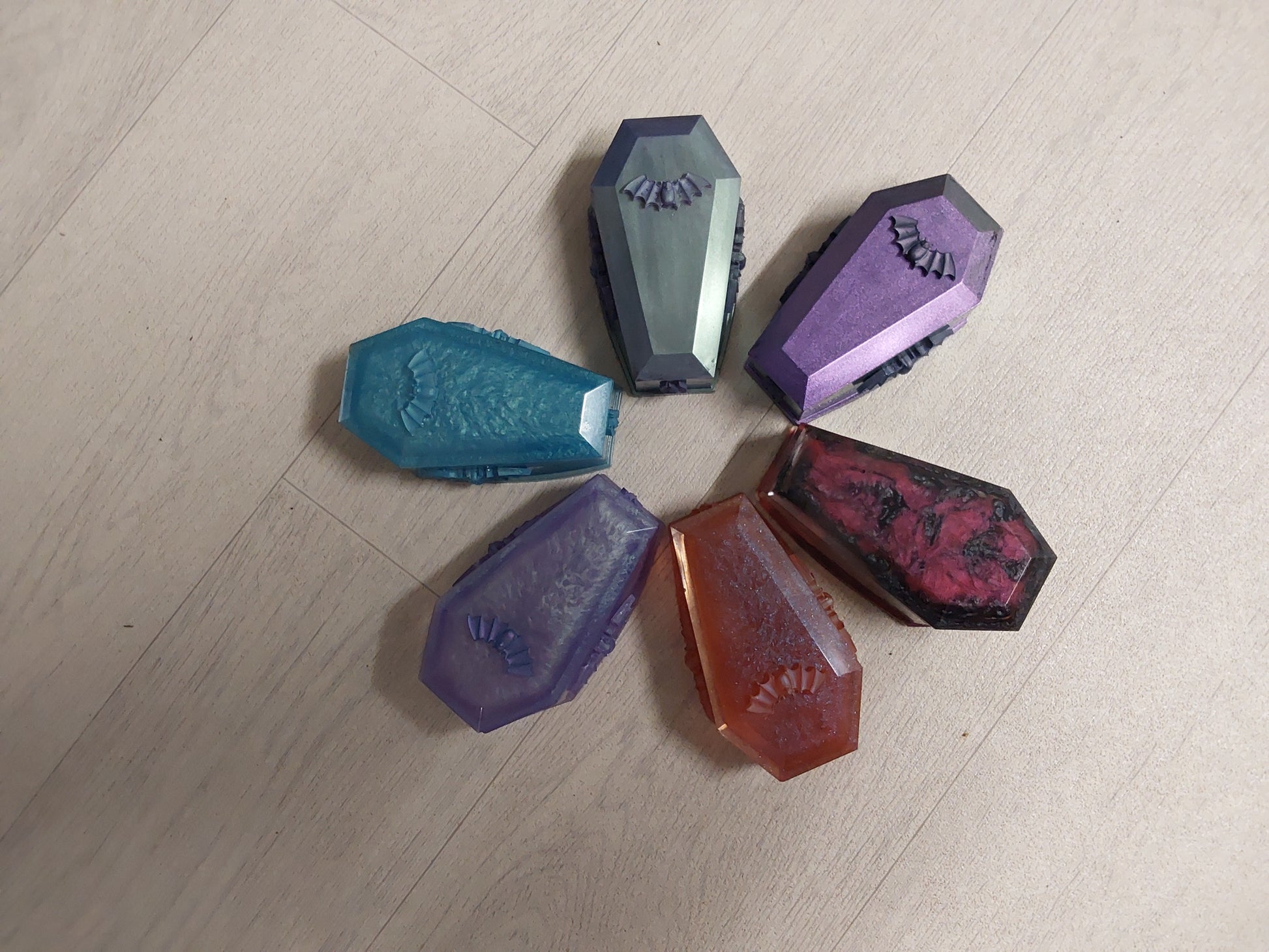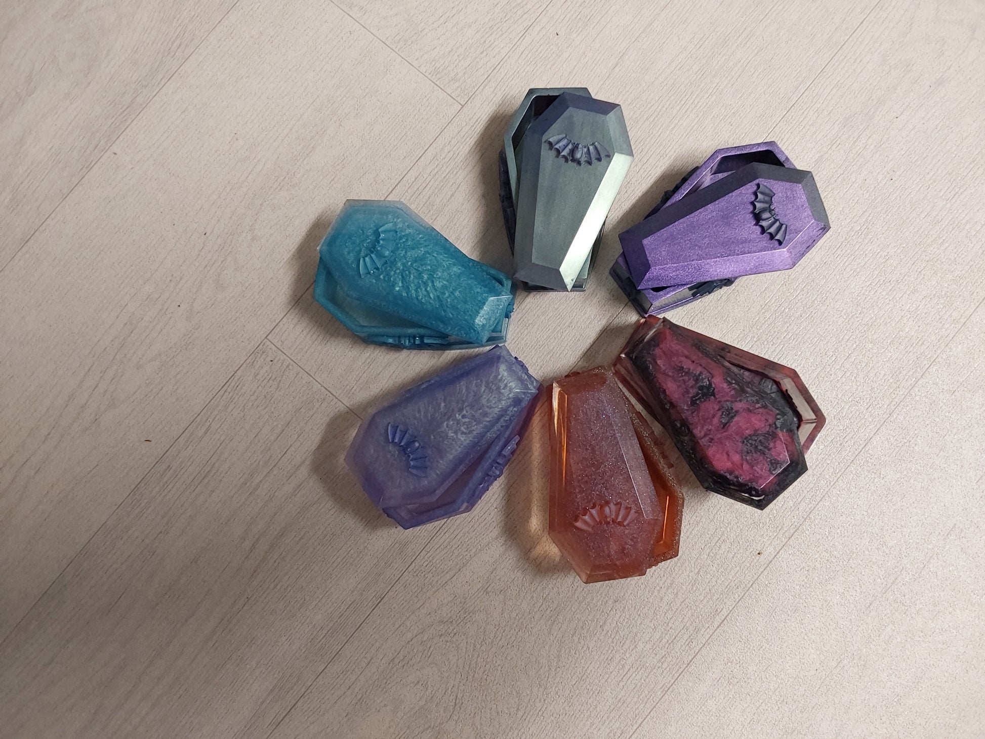 Resin coffin with lid. This coffin, decorated with bats, would fit perfectly in any witchy home. Please note black one does not have bats on. Measures approximately 12cm length, 7.5cm width and 4cm depth.