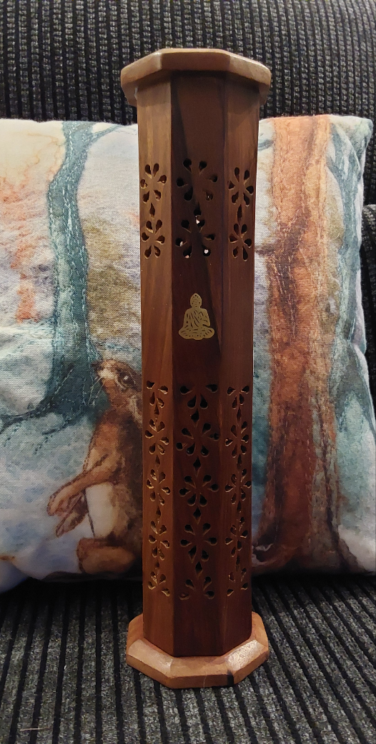 Buddha wooden incense tower to hold incense sticks and/or cones. Measures approximately 3ocm in height.