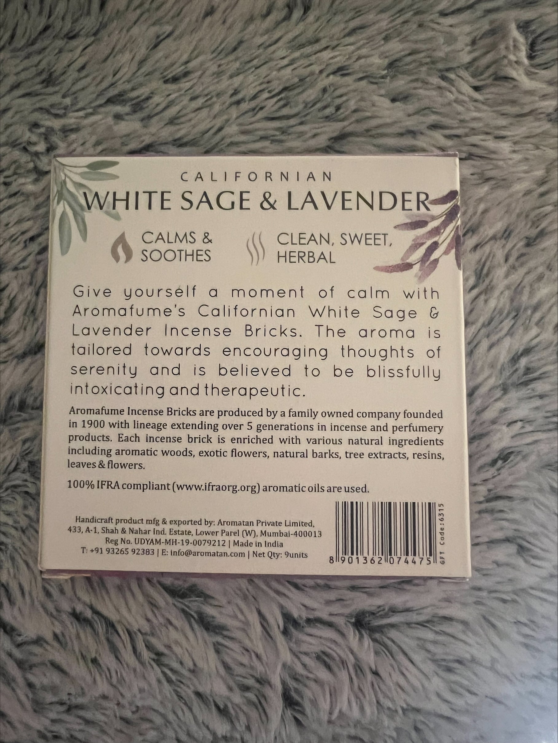 Give yourself a moment of calm with Aromafume's Californian White Sage & Lavender Incense Bricks. The aroma is tailored towards encouraging thoughts of serenity and is believed to be blissfully intoxicating and therapeutic. Contains 9 Incense Bricks