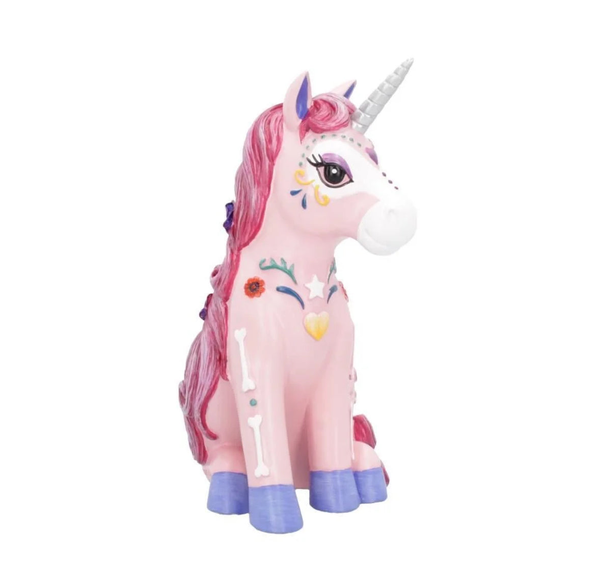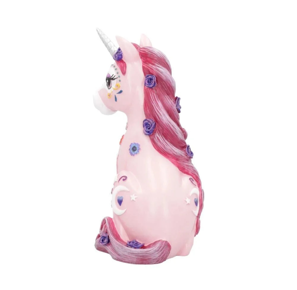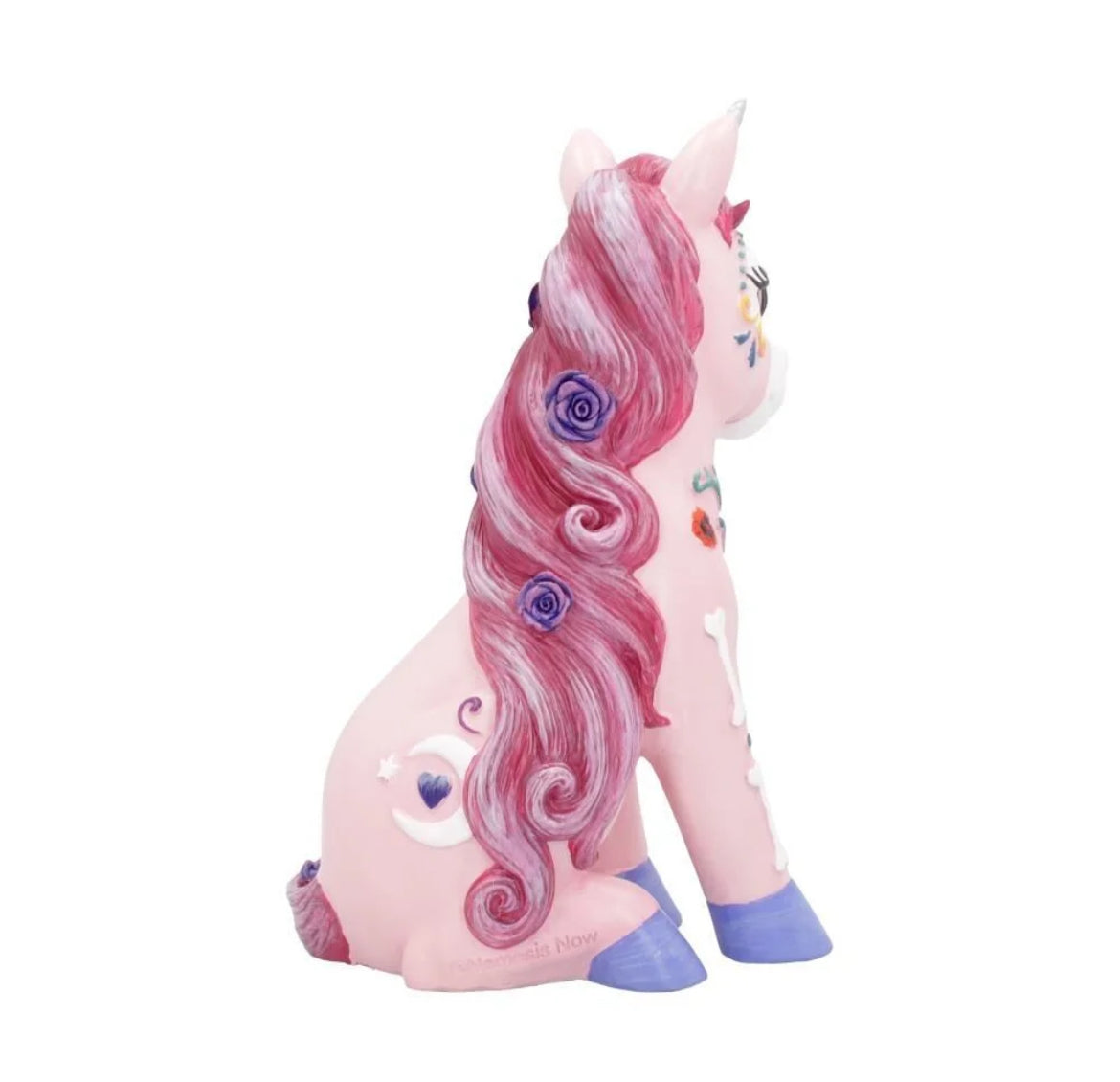 Sitting upright, a pink tail curling around its hooves, this baby pink unicorn looks straight ahead, a bone white mask covering their face while a long silver horn emerges from their its forehead. their body is covered in colourful patterns and designs of flowers, love hearts and bones, standing out on their body and making them look like a mexican calavera. Cast in the finest resin being lovingly hand painted, this is perfect for anyone who is a lover of macabre fantasy.