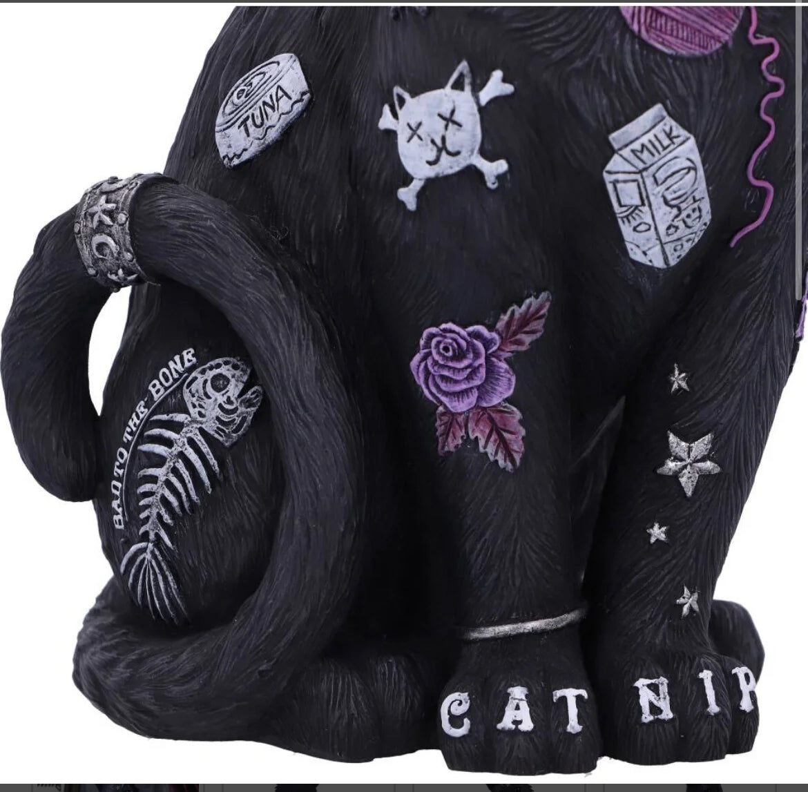 This kitty may look cute but he is definitely bad to the bone. His big black glossy eyes stare right back at you, a skull choker sits around his neck and his body is covered in tattoos which would appeal to any naughty familiar. The words Cat Nip sits on his paws. Cast in the finest resin before being carefully being carefully hand painted. This Bad to the Bone Kitty would make the perfect addition to any gothic or feline collection.
