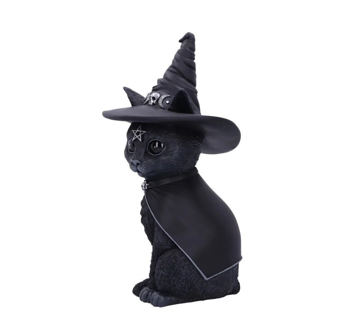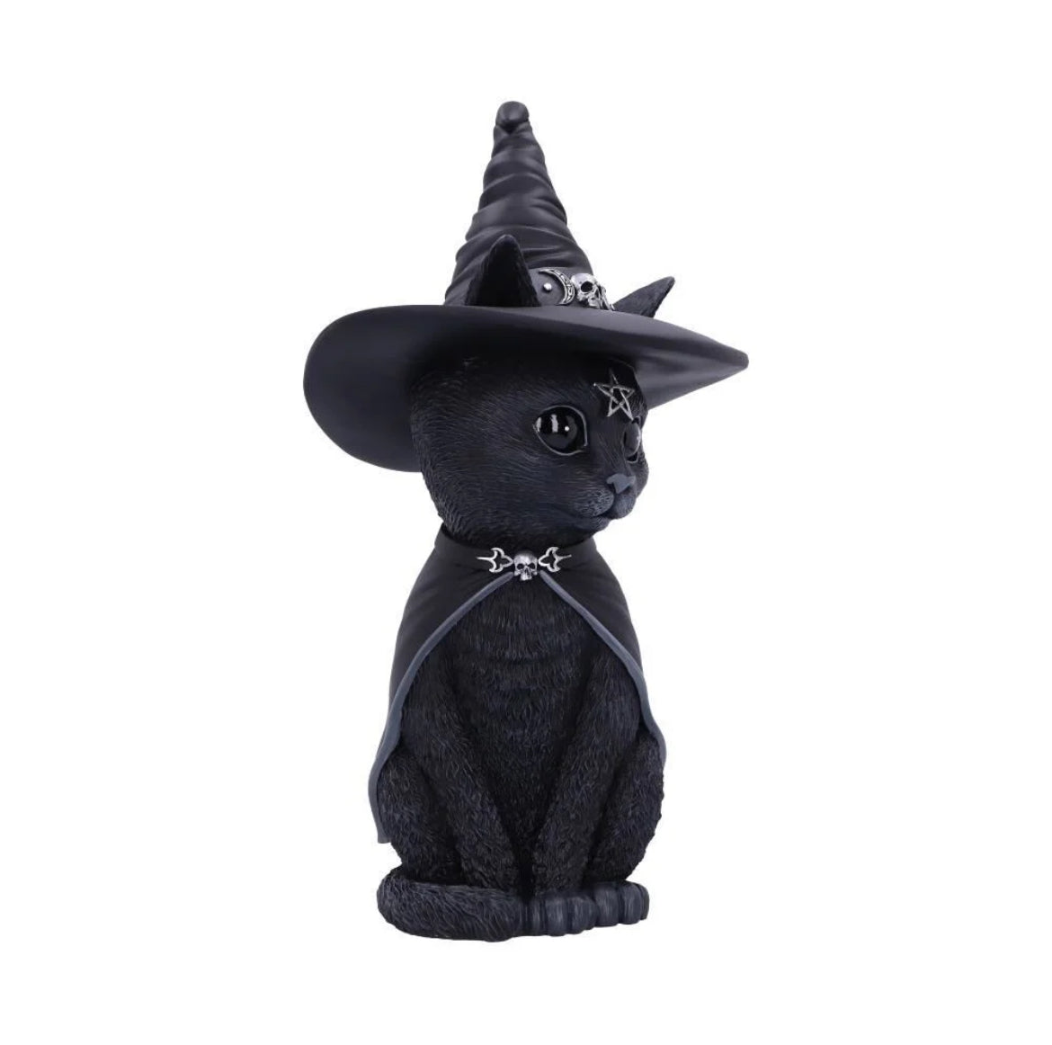 This witch cat Purrah, is a strange creature, the union of good and bad. As you look into its black eyes you notice that all is not as it seems, darkness resides within. The cat appears to be channelling the spirit of the witch, encaspulated by a large pointed hat and smooth cape. The cat is decorated in ornate silver detailing and occult symbology. Cast in high quality resin and carefully hand painted, this figurine is likely to be the cutest occultist you have ever seen. Height 30cm