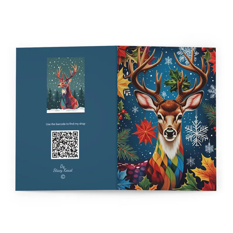 Let this colourful, festive stag brighten the day for your friends and family. Measures approximately 21cm by 15cm. Envelope included