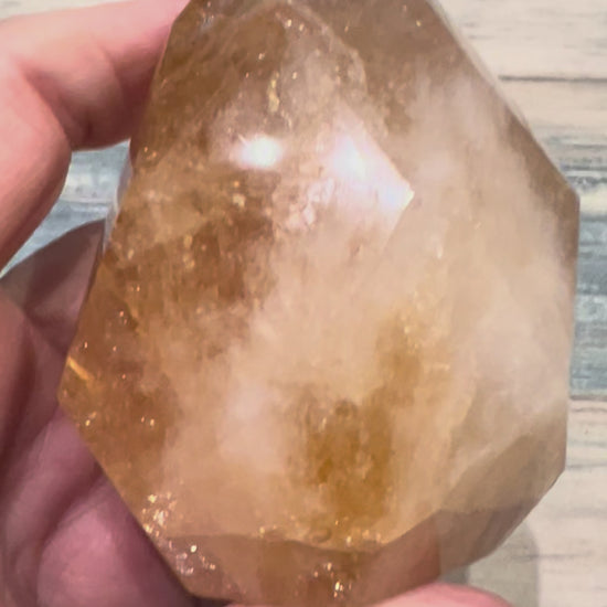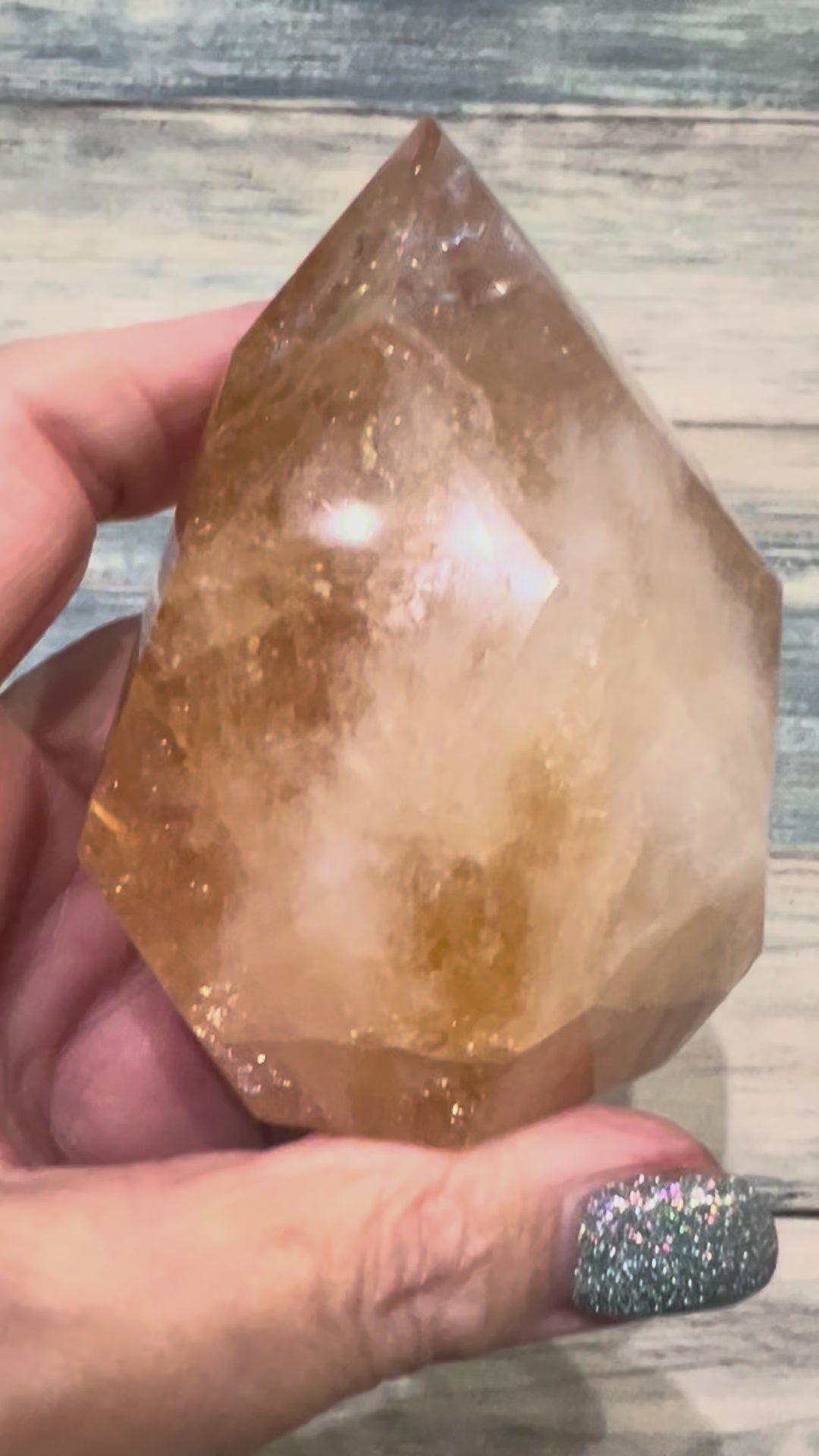 Citrine's spiritual properties are associated with prosperity, abundance, joy, and manifestation. It is known as the "merchant's stone" for attracting wealth and is linked to the Solar Plexus chakra, which is the center of personal power, self-esteem, and confidence. Other properties include dispelling negativity, boosting confidence, and promoting mental clarity. Height approximately 9cm. Width 6cm. weight 340g