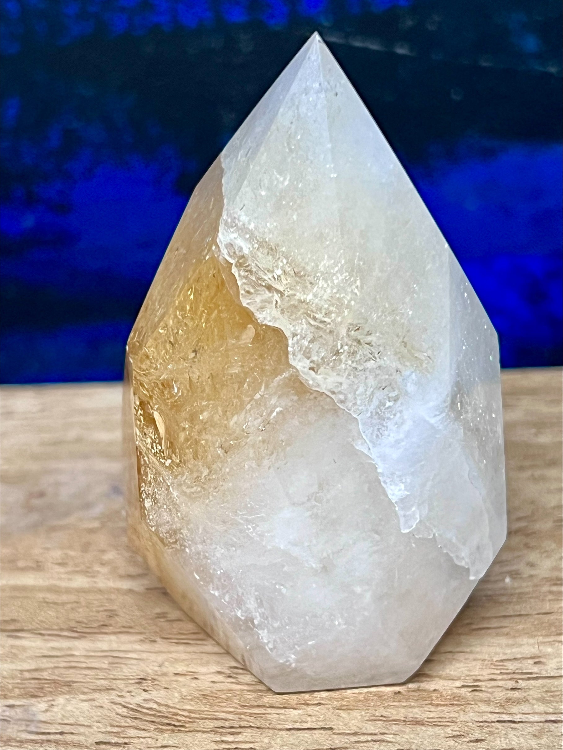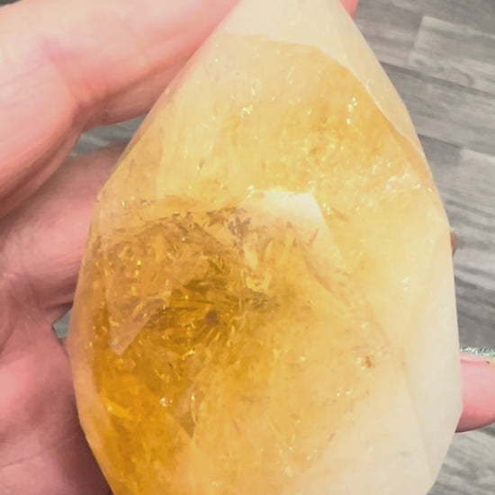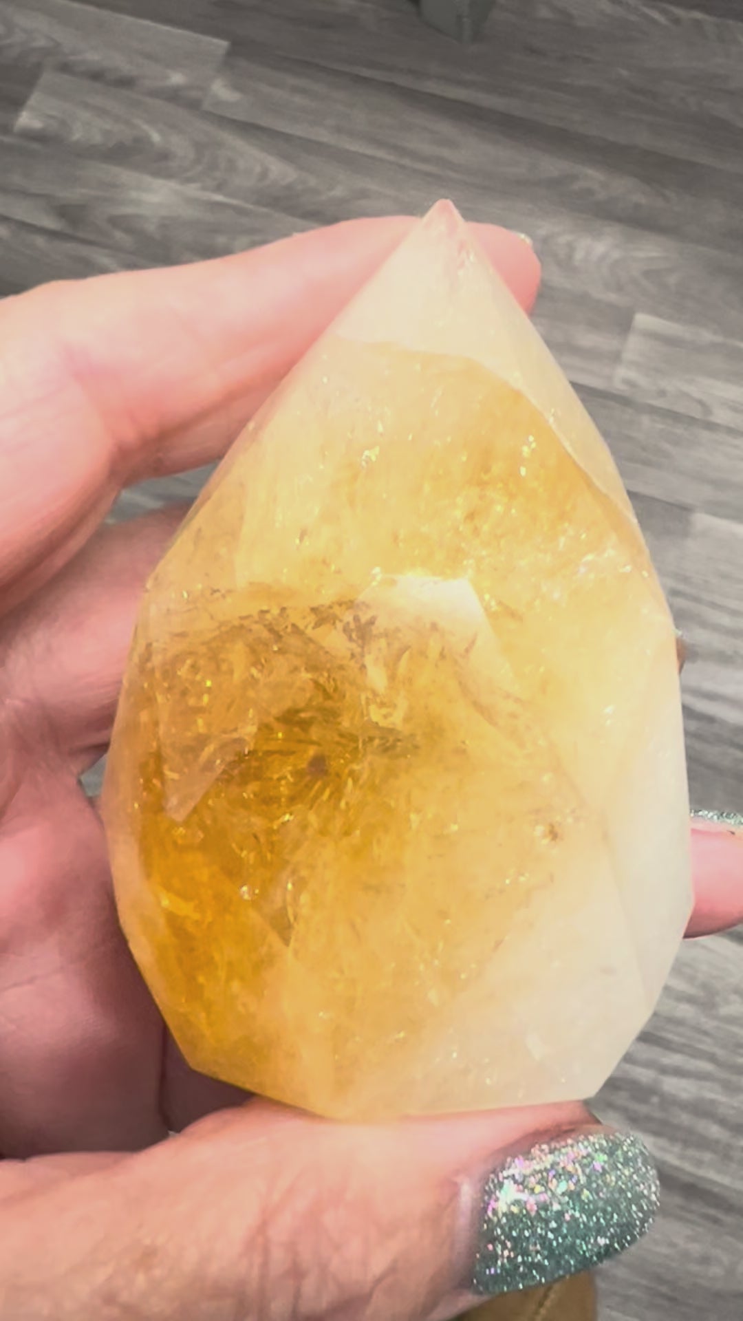 Citrine's spiritual properties are associated with prosperity, abundance, joy, and manifestation. It is known as the "merchant's stone" for attracting wealth and is linked to the Solar Plexus chakra, which is the center of personal power, self-esteem, and confidence. Other properties include dispelling negativity, boosting confidence, and promoting mental clarity. Height approximately 7cm. Width 4cm. weight 174g