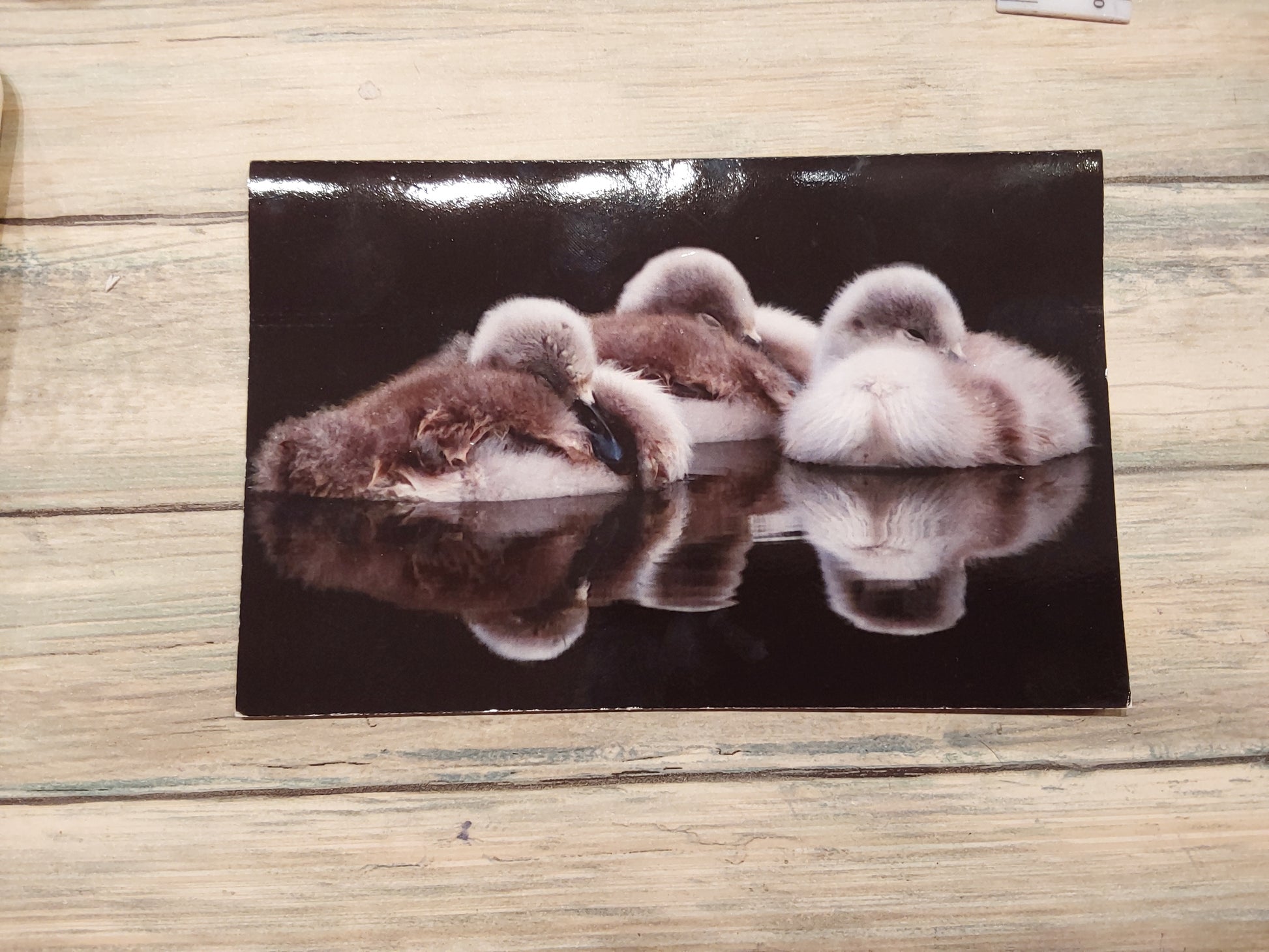 This stunning card shows three cygnets sleeping whilst their reflection stills in the water. Blank in side. 18 cm by 11.5cm