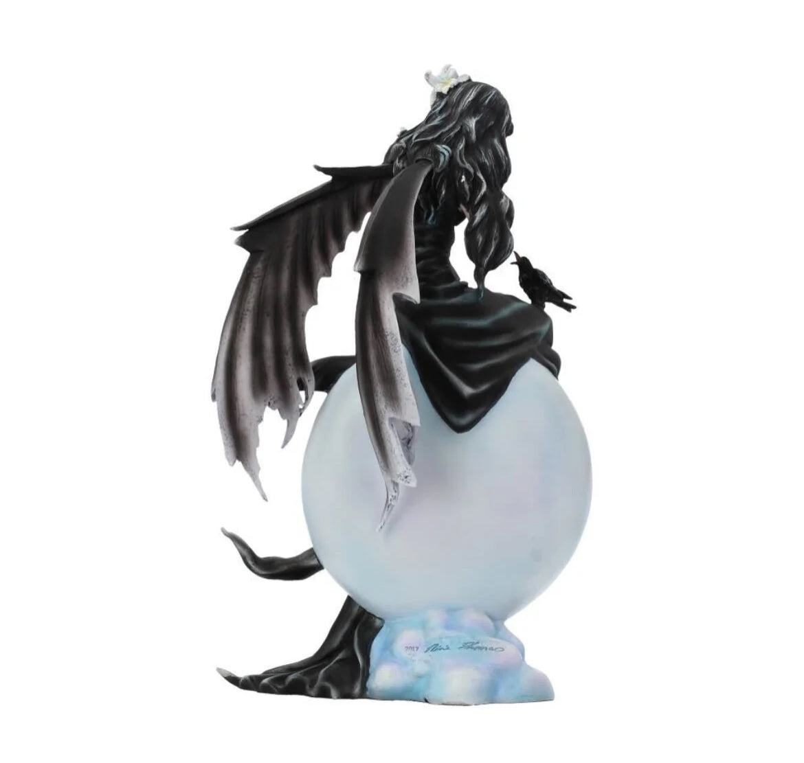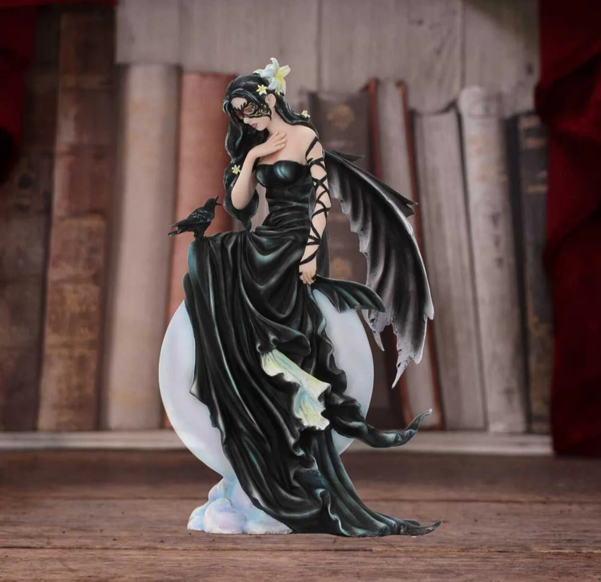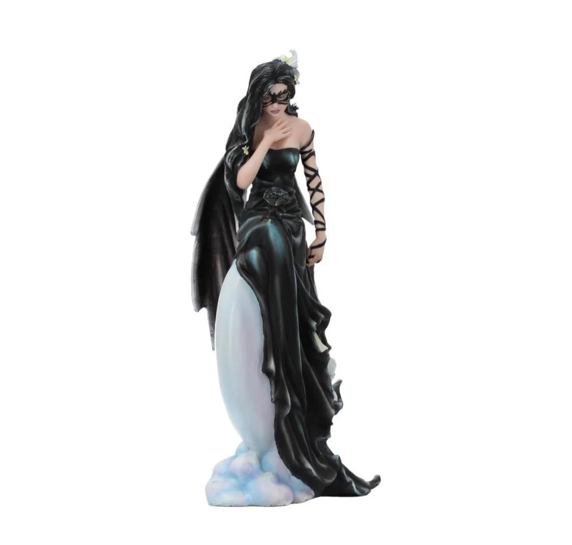 From Gothic brand Nemesis Now's giftware collection, this mysterious Fantasy figurine comes from the enchanting imagination of Fantasy artist and writer Nene Thomas. Sitting on a full moon, the end of her long black evening gown trailing through a small cloud, this raven-haired Fairy has her wings relaxed behind her. She wears a black carnival mask with gold trim, as well as white flowers in her hair. On her knee, a raven caws at her. She looks down at it, one hand pressed to her chest as if she can't believe what she's being told. Cast in high-quality resin before being painstakingly hand-painted, this fantastic Fantasy figurine is a great gift for any lover of beauty and gossip.