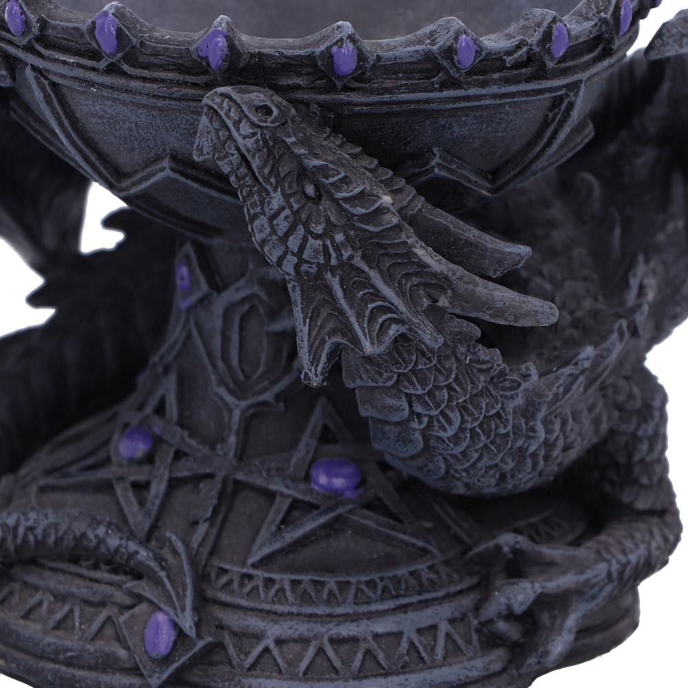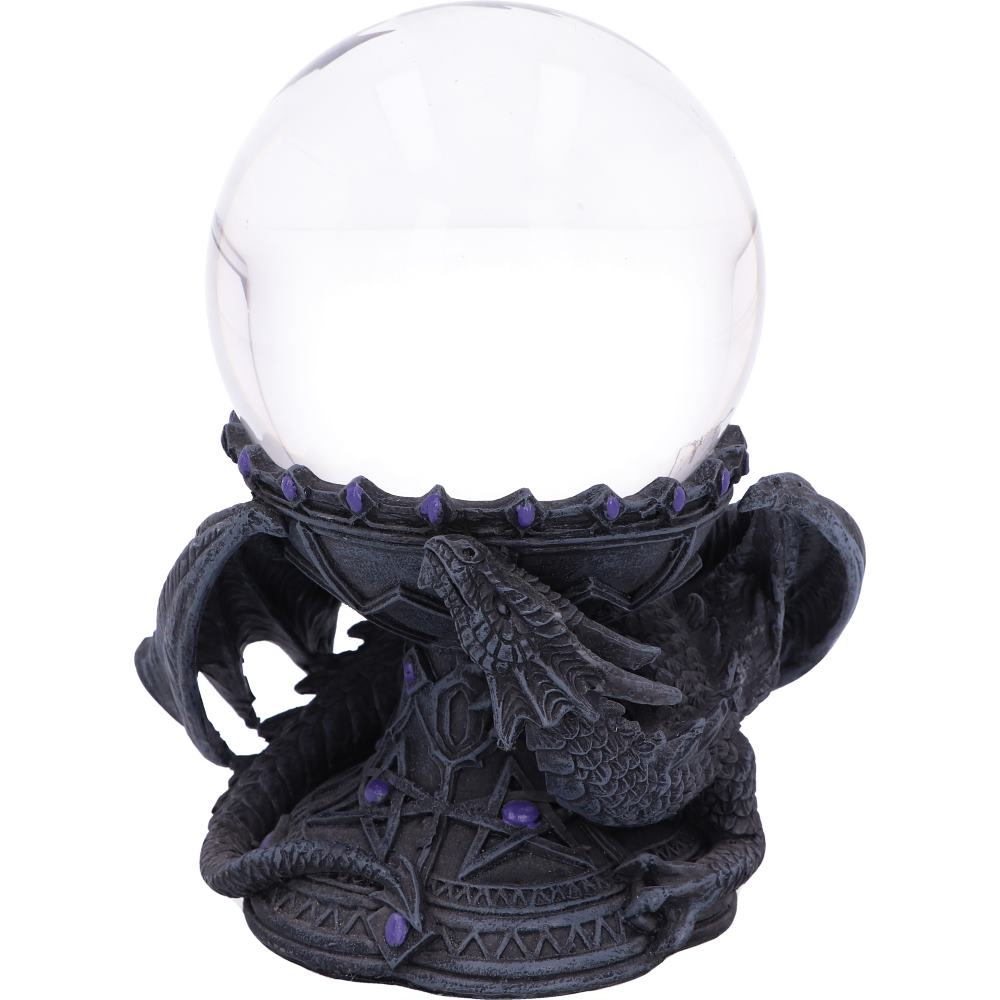 From the enchanted imagination of internationally renowned Gothic and Fantasy artist Anne Stokes, this exquisite beauty crystal ball holder is completely beautiful! It is home to a black Dragon who curves around the base, keeping watch over his crystal hoard, With raised pentagrams rising from beneath him, this piece has a real traditional Gothic feel. Each pentagram and small diamond decoration features a small purple stone, breaking up the dark colour of the holder. Cast in the finest resin before being carefully hand-painted, this piece is perfect for any lover of Gothic beauty.