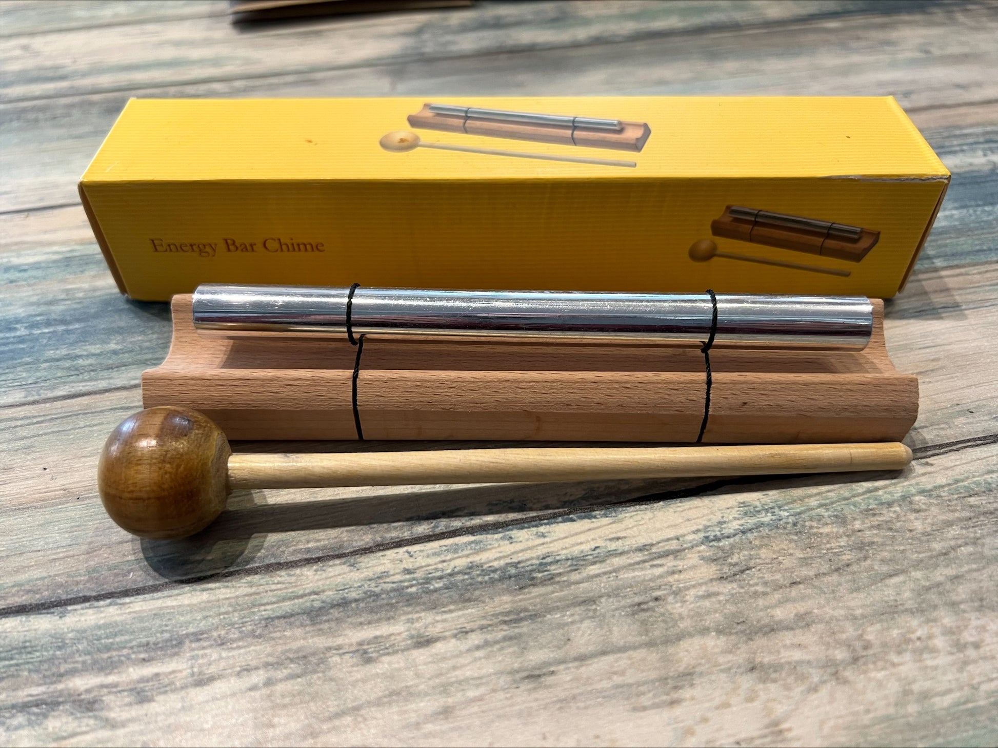 Energy chimes, also known as chime bars, are single sound bars made of aluminum, mounted on a wooden base, and struck with a small mallet to produce a high-pitched sound.
