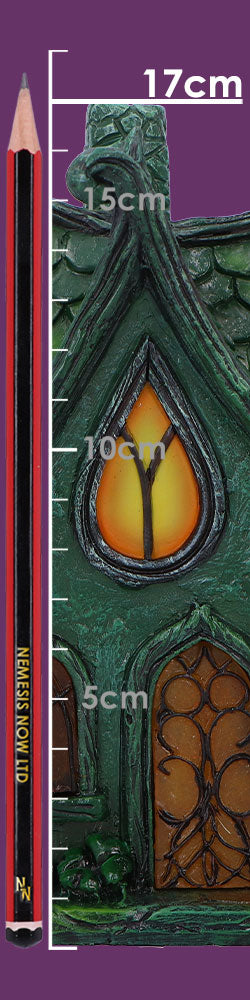 "Evergreen Lodge" Gothic-Inspired Fairy Cottage Evergreen Lodge is a gothic-inspired fairy cottage that embodies the magic of an enchanted forest. With a pointed, angular roof featuring dark green, scale-like shingles, and five windows, four of which are illuminated by LED lights, this piece exudes medieval fantasy charm. Sculpted vines, tree roots, and curled roof edges enhance its forest-like atmosphere, while the dark green base, accented with lighter green details, adds depth and intrigue. The small chimney at the peak completes the rustic fairy-tale look. Ideal for garden decor or fantasy-themed displays, Evergreen Lodge is securely packaged for easy merchandising. Perfect for retailers specializing in fantasy, medieval, or fairy-tale items, this captivating piece is sure to enchant customers looking to add a touch of magic to their home or garden."