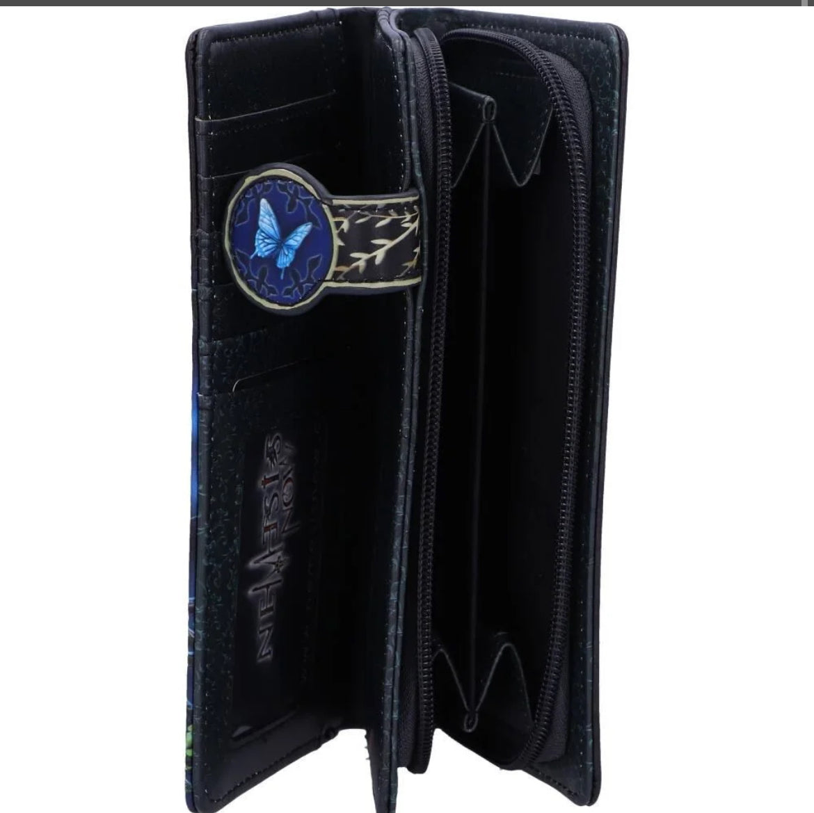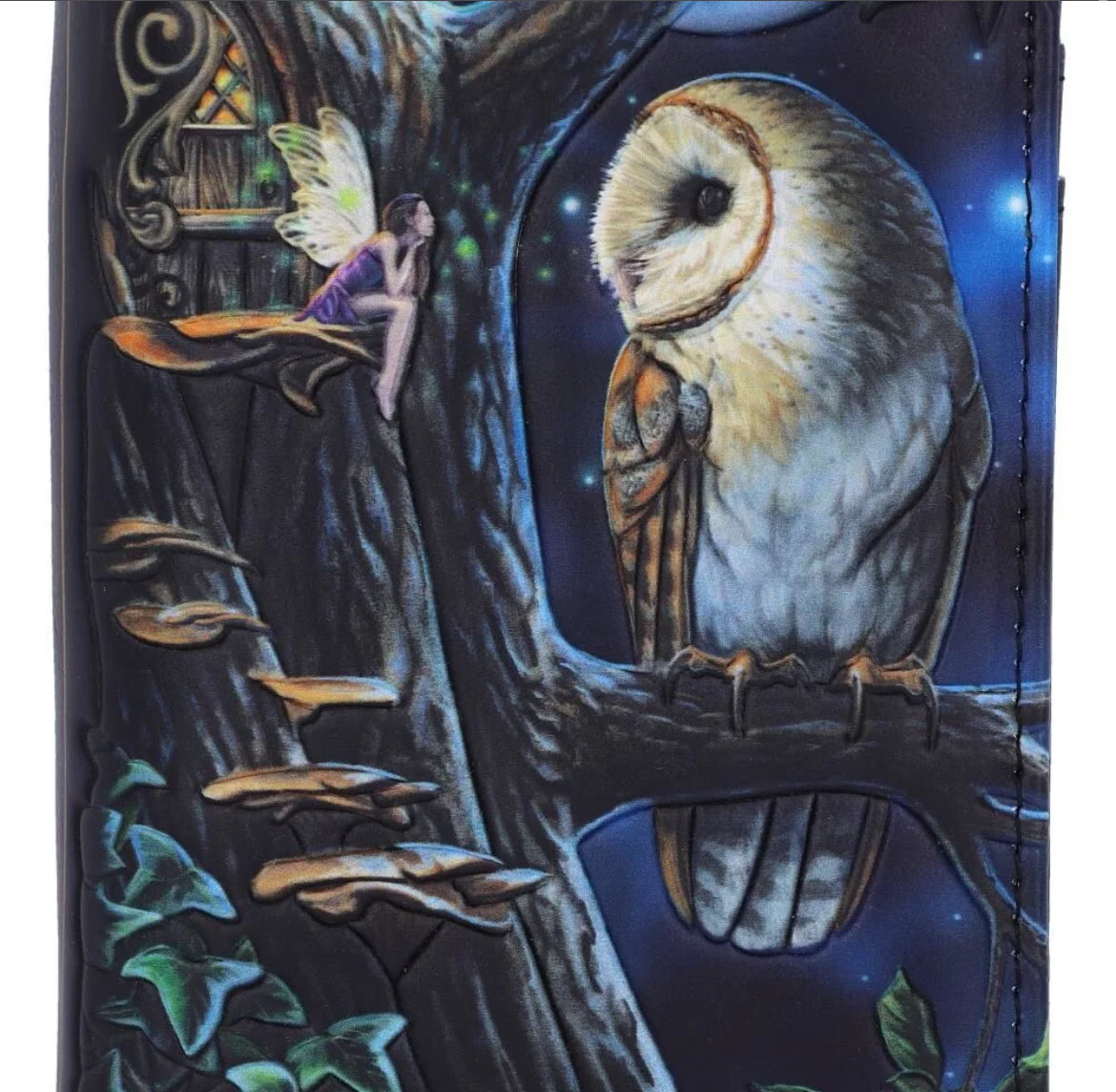 From the magical mind of Lisa Parker, we are able to bring to you this stunning Fairy Tales purse. Made to the highest standards, this purse offers many slots for cards, a section for notes and a zipped compartment for coins. A large owl perches on a sturdy branch, talons gripping the bark as tight as they can, while a small fairy sits on the edge of a bark mushroom. A small fairy door can be seen behind her, inside glows and makes you feel warmth and homliness. Wearing a purple dress she leans forward, her brunette hair sweeping over her shoulder. The pair make the most unlikely companions, yet they stare lovingly into each others eyes underneatht he midnight sky.