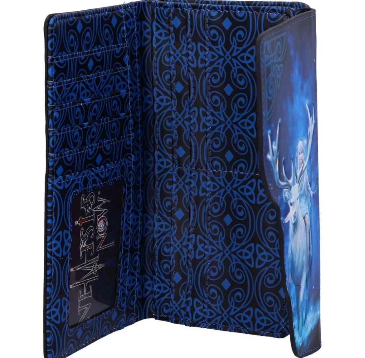 Designed by the renowwned Gothic and Fantasy artist Anne Stokes. This stylish and spacious purse has numerous slots for cards, a space for notes and a zipped compartment for coins. Riding upon a mighty white stag, this Elvin Queen is at one with our Earth. Possessed by nature, she conjures magic with the fantasy forest and allows it to transfer through her being as glistening orbs of enchantment.