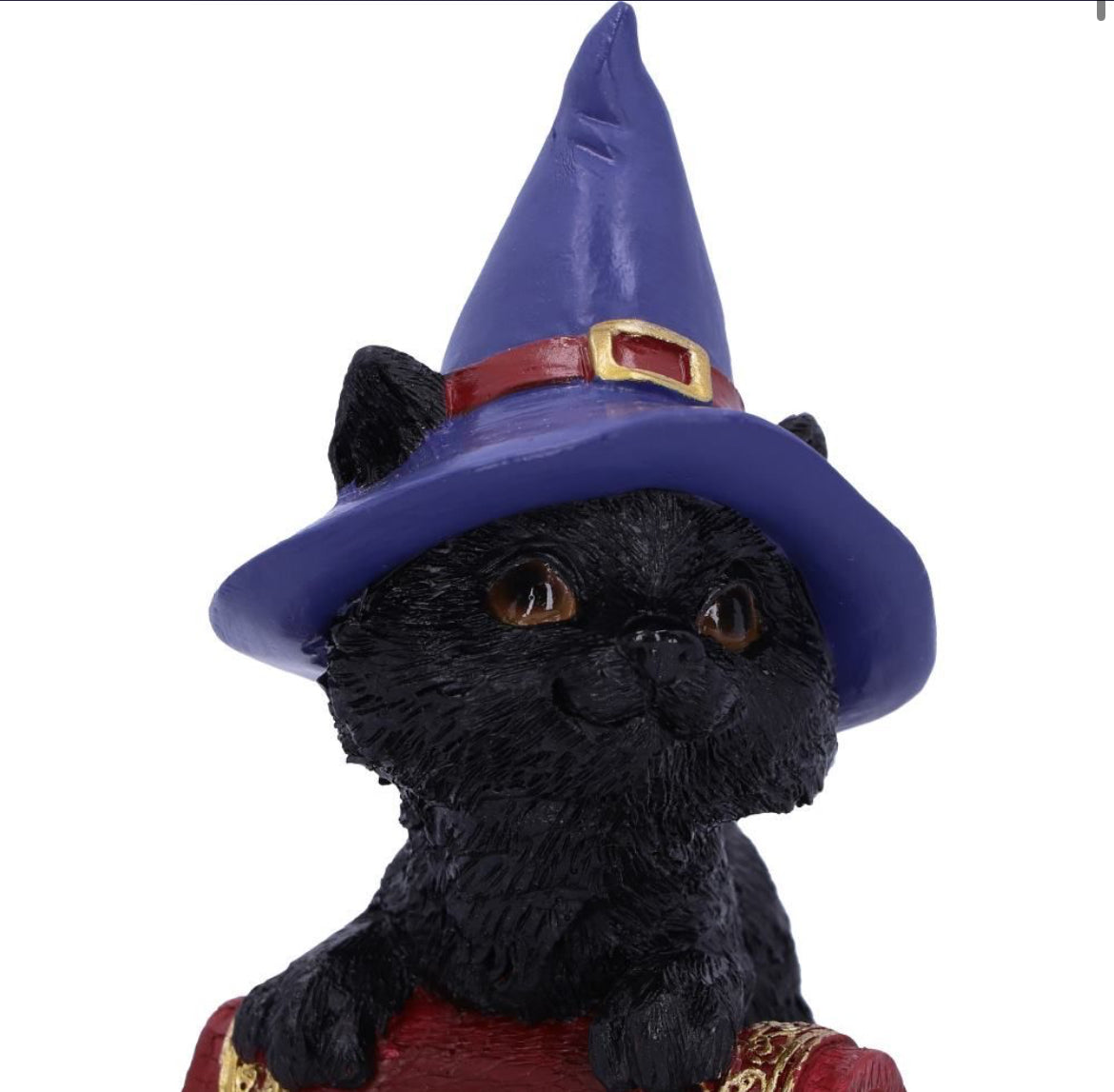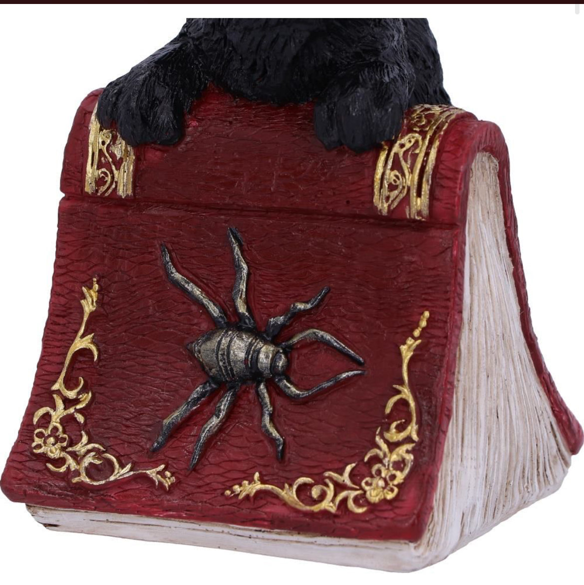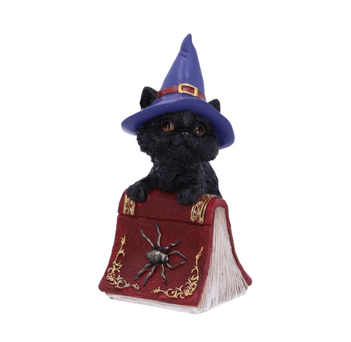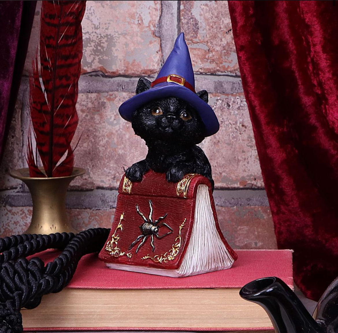 From alternative brand Nemesis Now, this charming cat figurine is cast in high-quality resin before being painstakingly hand-painted. Hocus is feeling playful while standing tall, next to a crimson spell book. With a purple Witches hat on her head and large silvered spider decorating the grimoire, this piece is the perfect gift for the charming witch in your life.