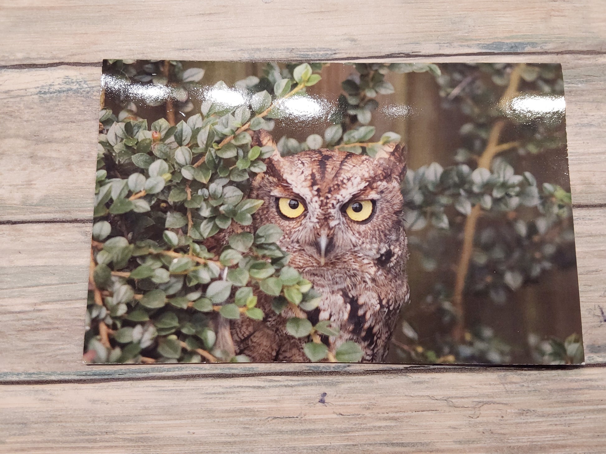 Peeking through the shrubbery, is this studious owl. He sees you and acknowledges you. Blank inside. 17.5 cm by 11.5 cm