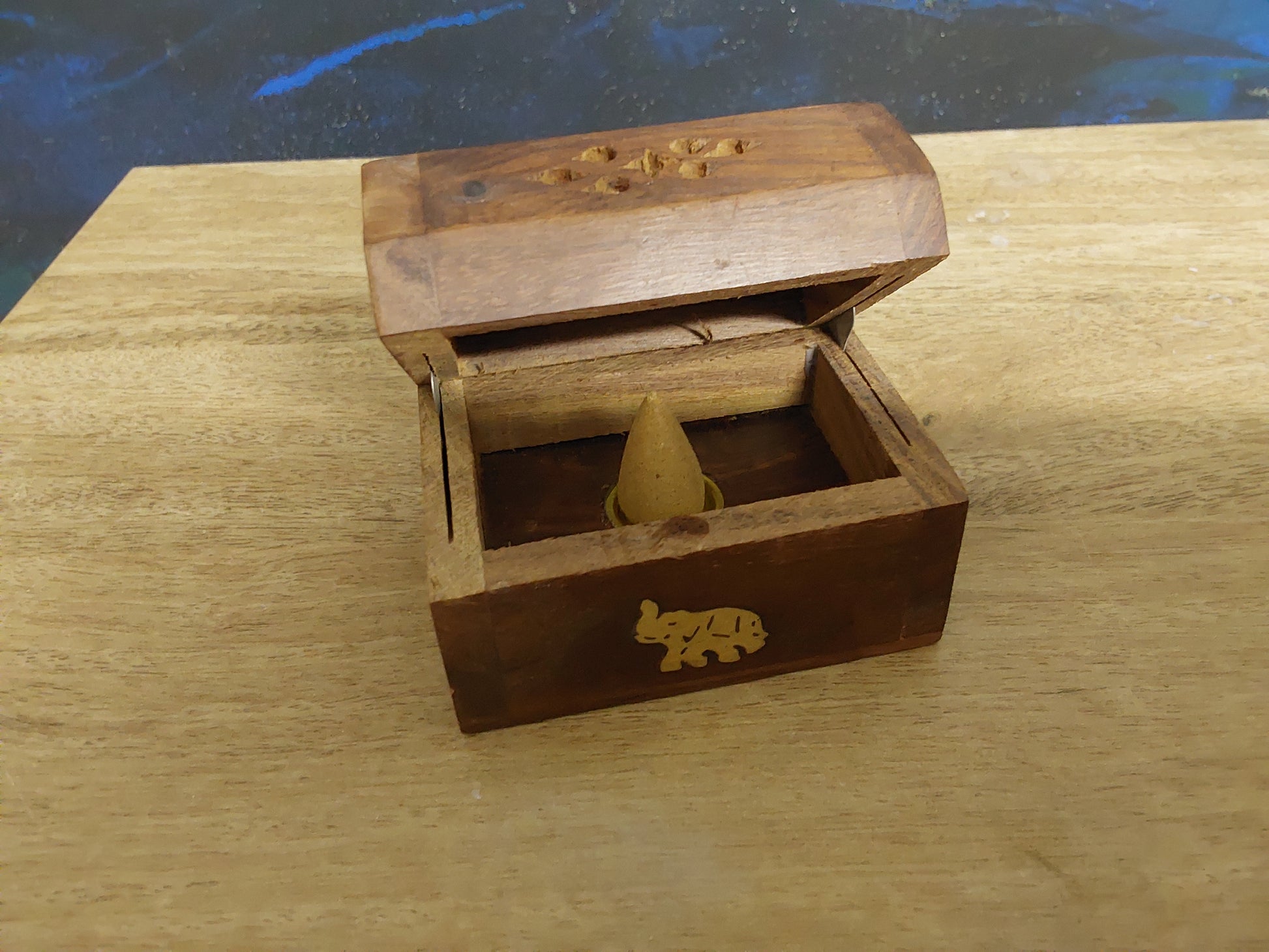Wooden incense holder box with brass elephant emblem. Use with lid open or closed. Measures approximately 8cm in length, 5cm deep and 5.8cm in height