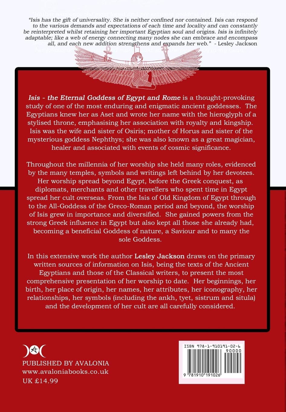 In this extensive work the author Lesley Jackson draws on the primary written sources of information on Isis, being the texts of the Ancient Egyptians and those of the Classical writers, to present the most comprehensive presentation of her worship to date. Her beginnings, her birth, her place of origin, her names, her attributes, her iconography, her relationships, her symbols (including the ankh, tyet, sistrum and situla) and the development of her cult are all carefully considered.
