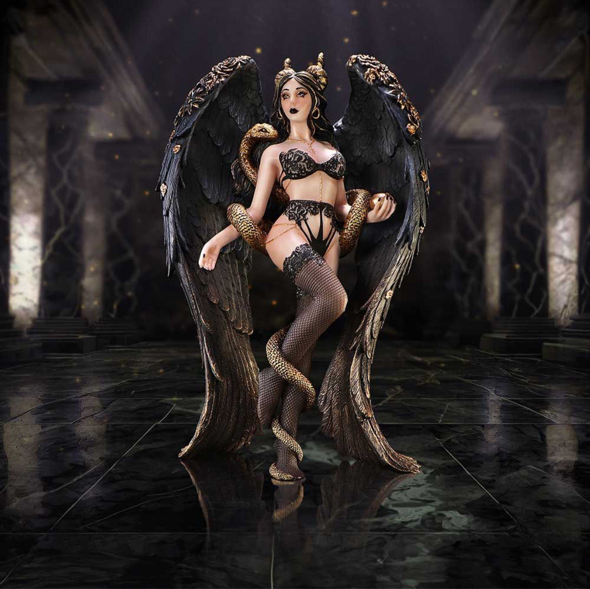 Introducing Lilith The First Temptress, a breathtaking figurine crafted by Nemesis Now. This exquisite piece captures Lilith, the primordial she-demon and first independent woman, in all her dark allure. Dressed in stunning black lingerie and adorned with intricate black wings, she coils around a golden serpent, embodying her seductive and manipulative nature. Cast in high-quality resin and meticulously hand-painted, this figurine is a masterful blend of mythology and gothic elegance. Packaged in a striking gift box that mirrors Lilith’s enigmatic essence, this piece is perfect for lovers of dark fantasy and gothic decor, promising to make a captivating statement in any space.