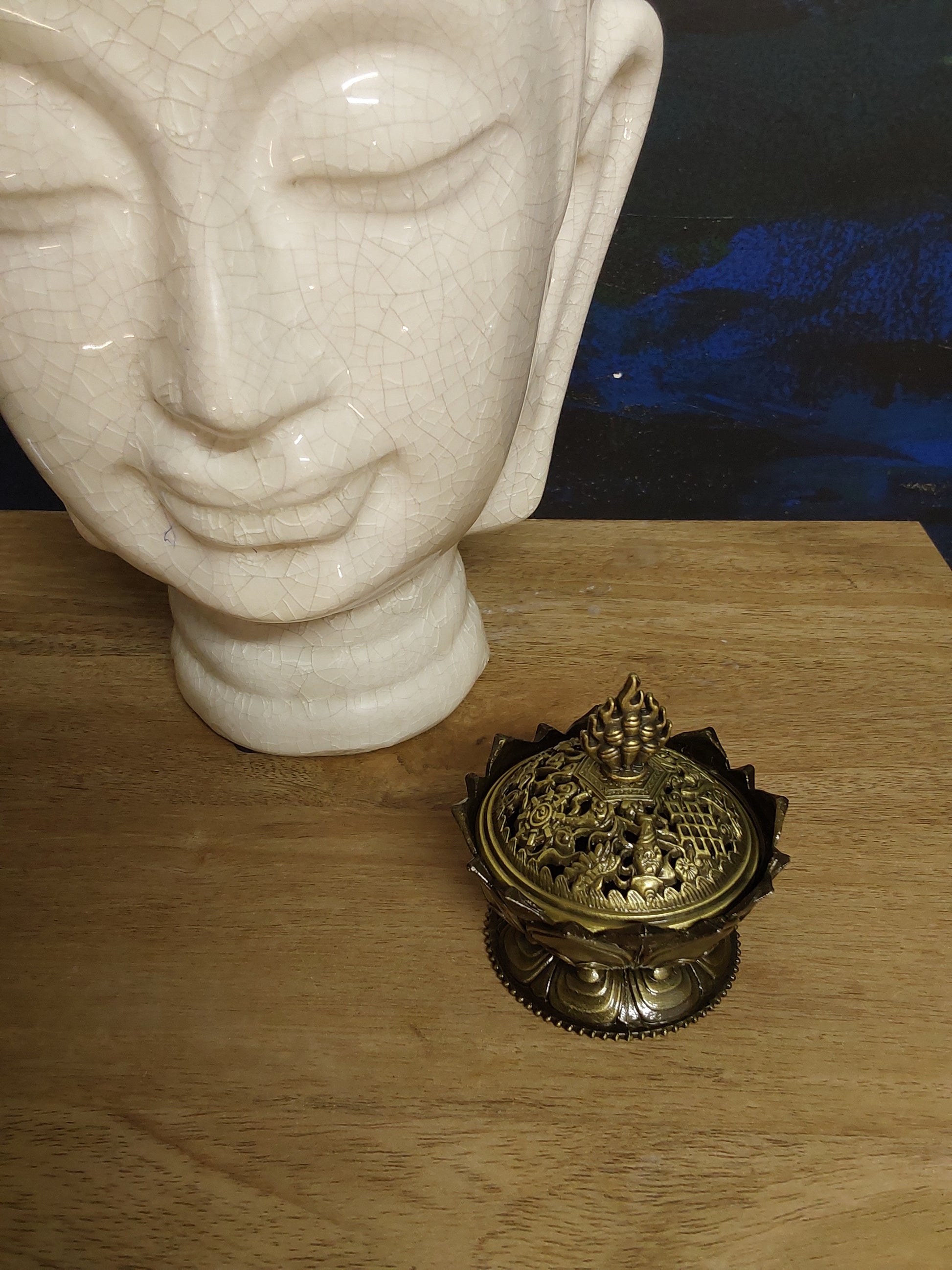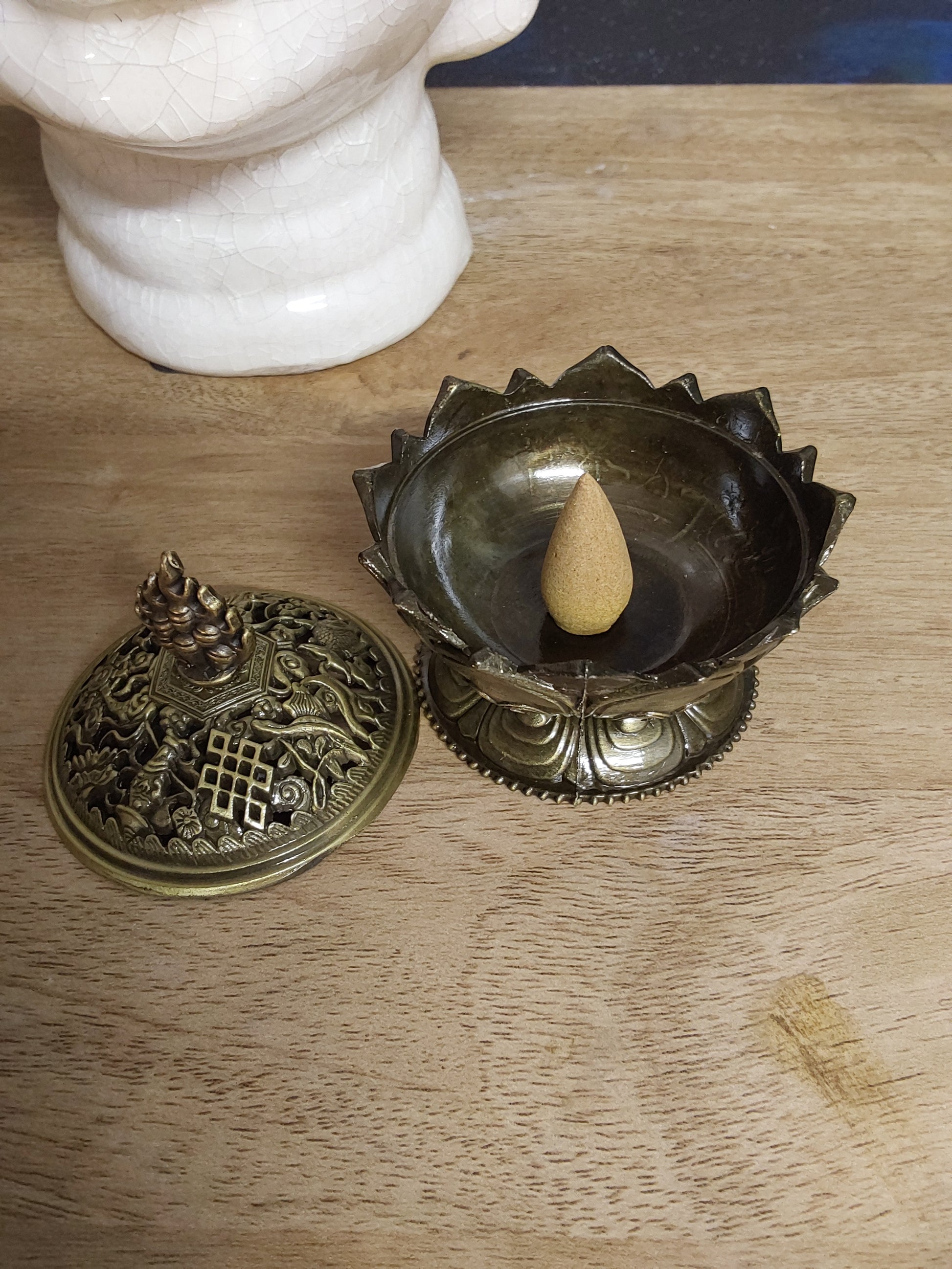 Intricate brass effect cone burner. Approximately 7cm diameter and 8cm in height.