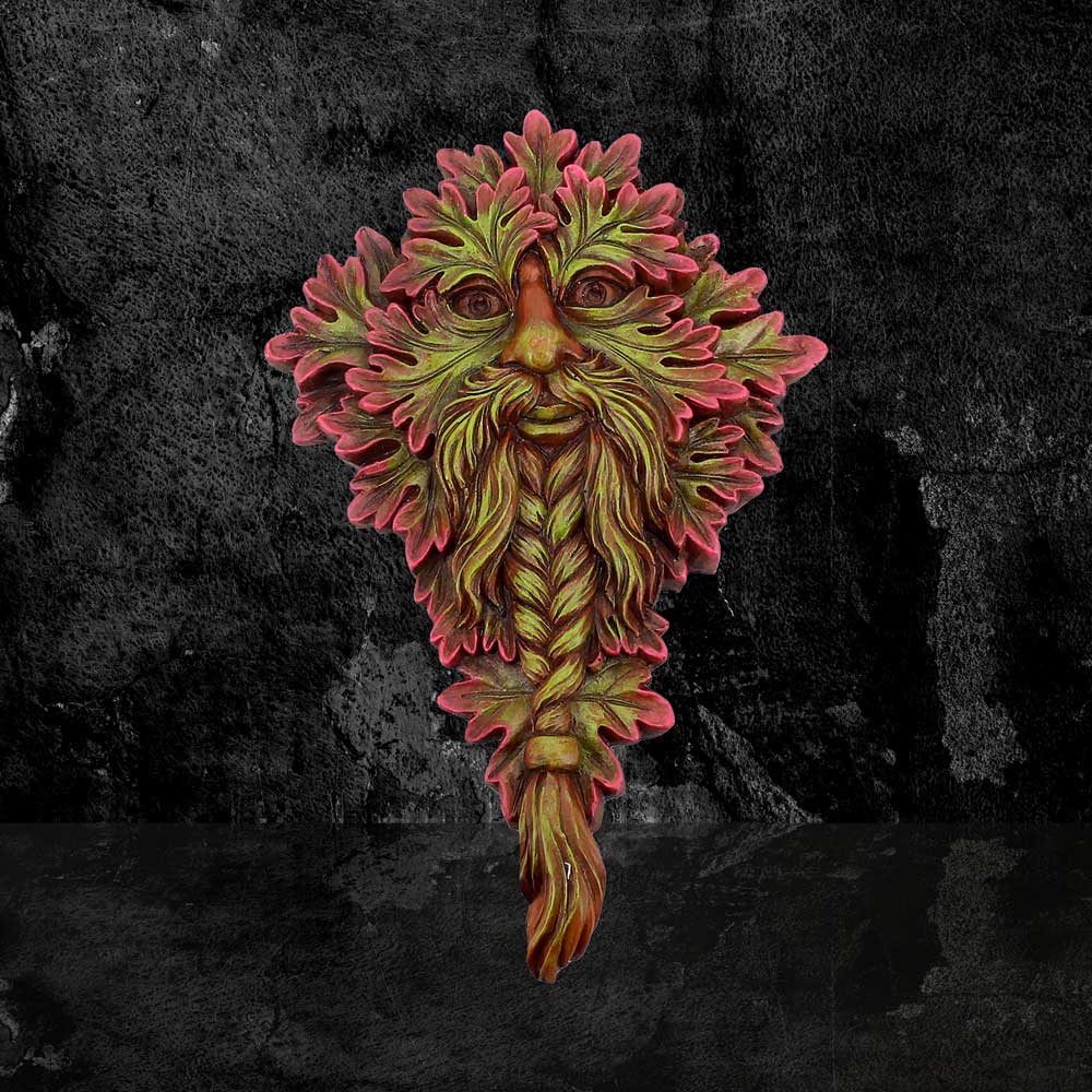 Mabon Wisdom 21.5cm Show your love for ancient shepherds of the forest with this wall mounted tree spirit plaque. His contented face is formed from autumn leaves, which are delicately edged in a deep fuchsia colour, and vines which create his plaited beard. Cast in high-quality resin before being painstakingly hand-painted, this piece will bring nature, magic and mystery into any home.
