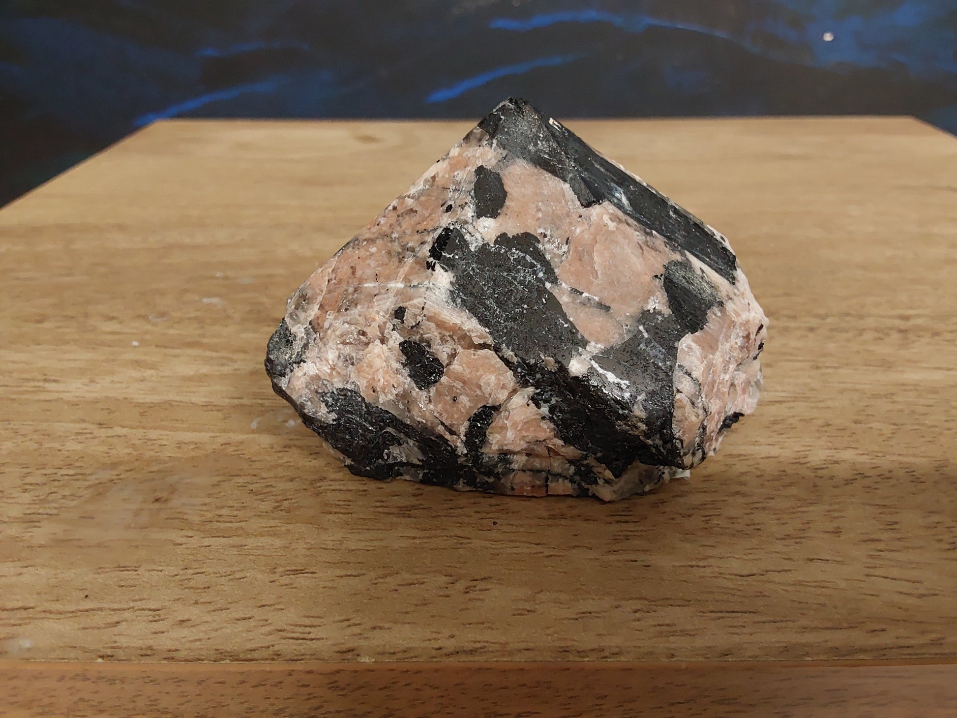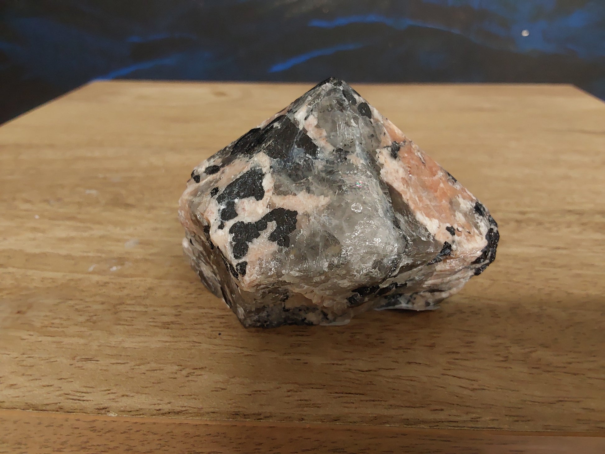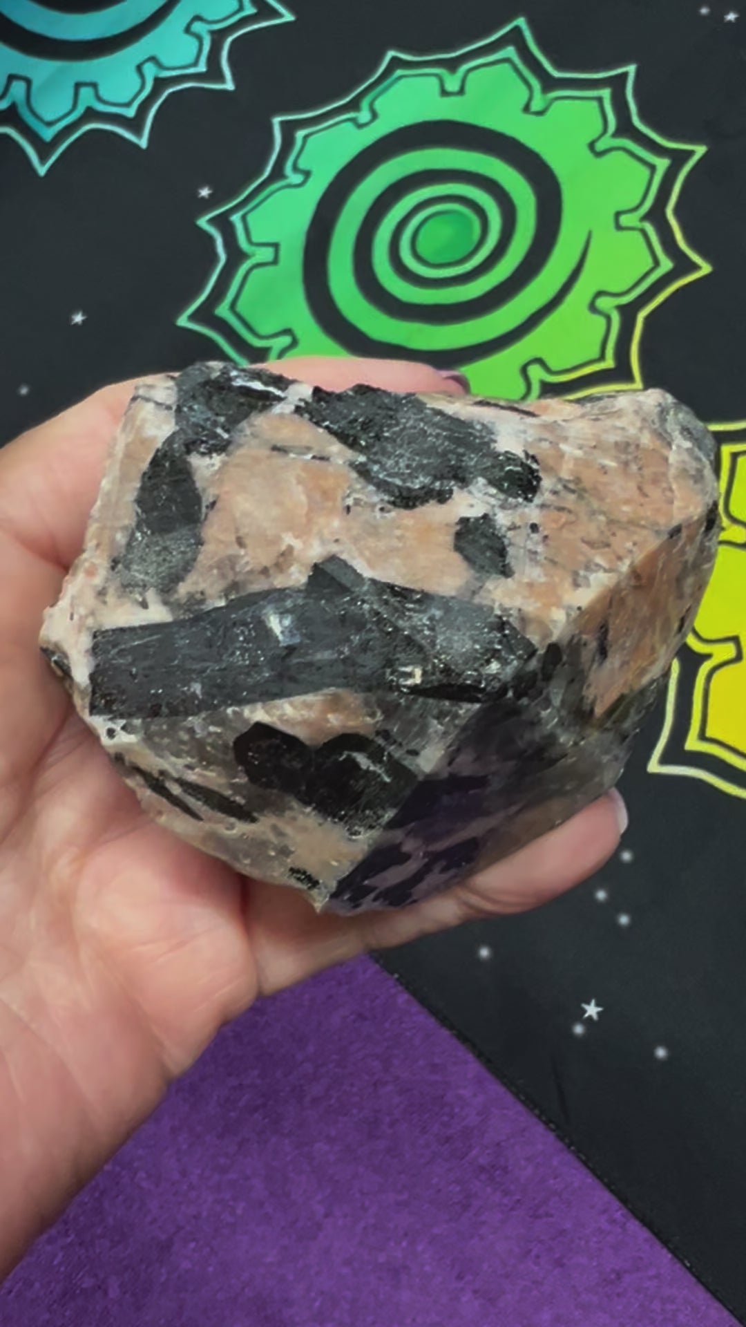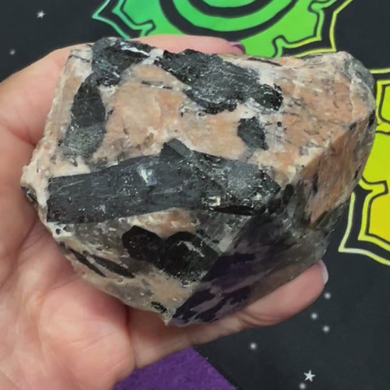 Along with sharing the same compassionate and loving energies of normal Moonstone, Black Moonstone provides complete protection of one's aura against negative energy. The gentle energy of White Moonstone, accented by the grounding Black Tourmaline, encourages self-nurturing and deep healing. Numerous times a day we all are faced with negativity, whether it be from a coworker, lover, family or yourself. Connects to lunar cycles and intuitive power. Weight 302g and approximately 9cm by 7cm.