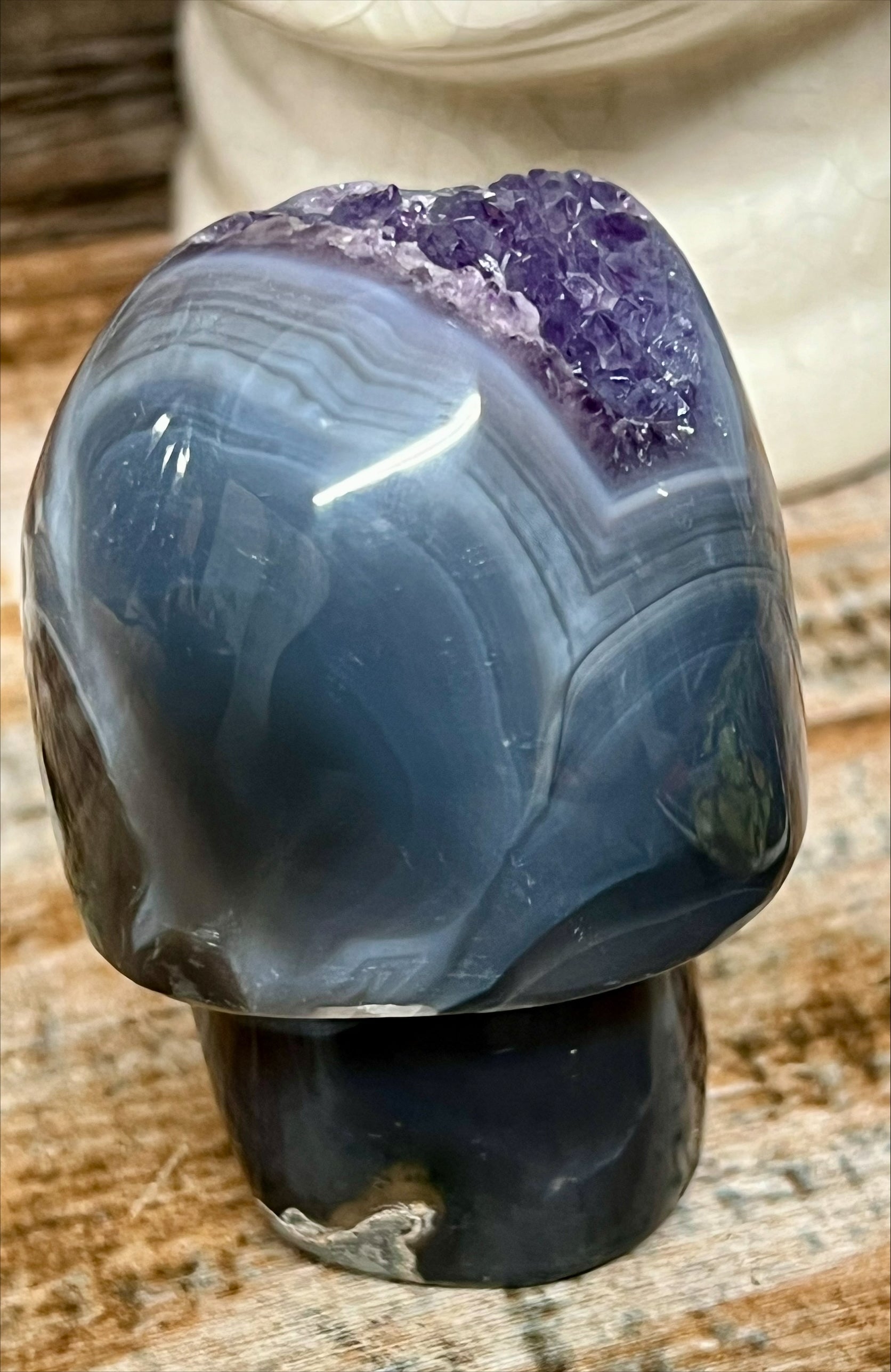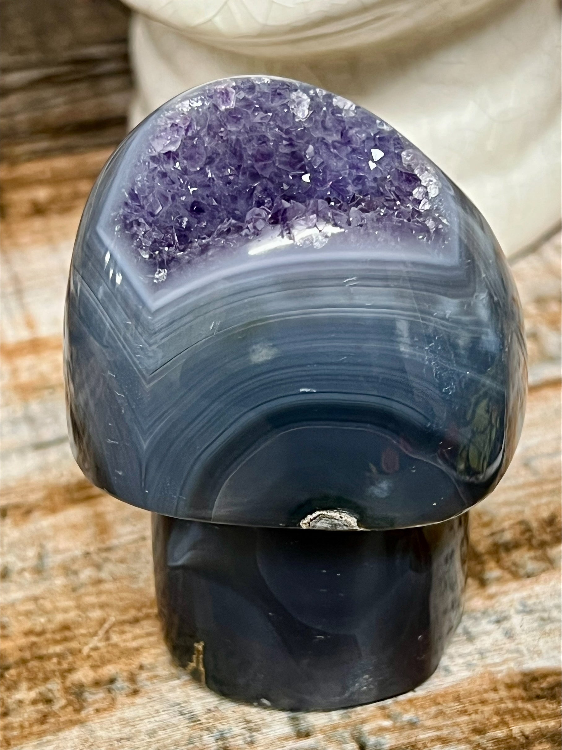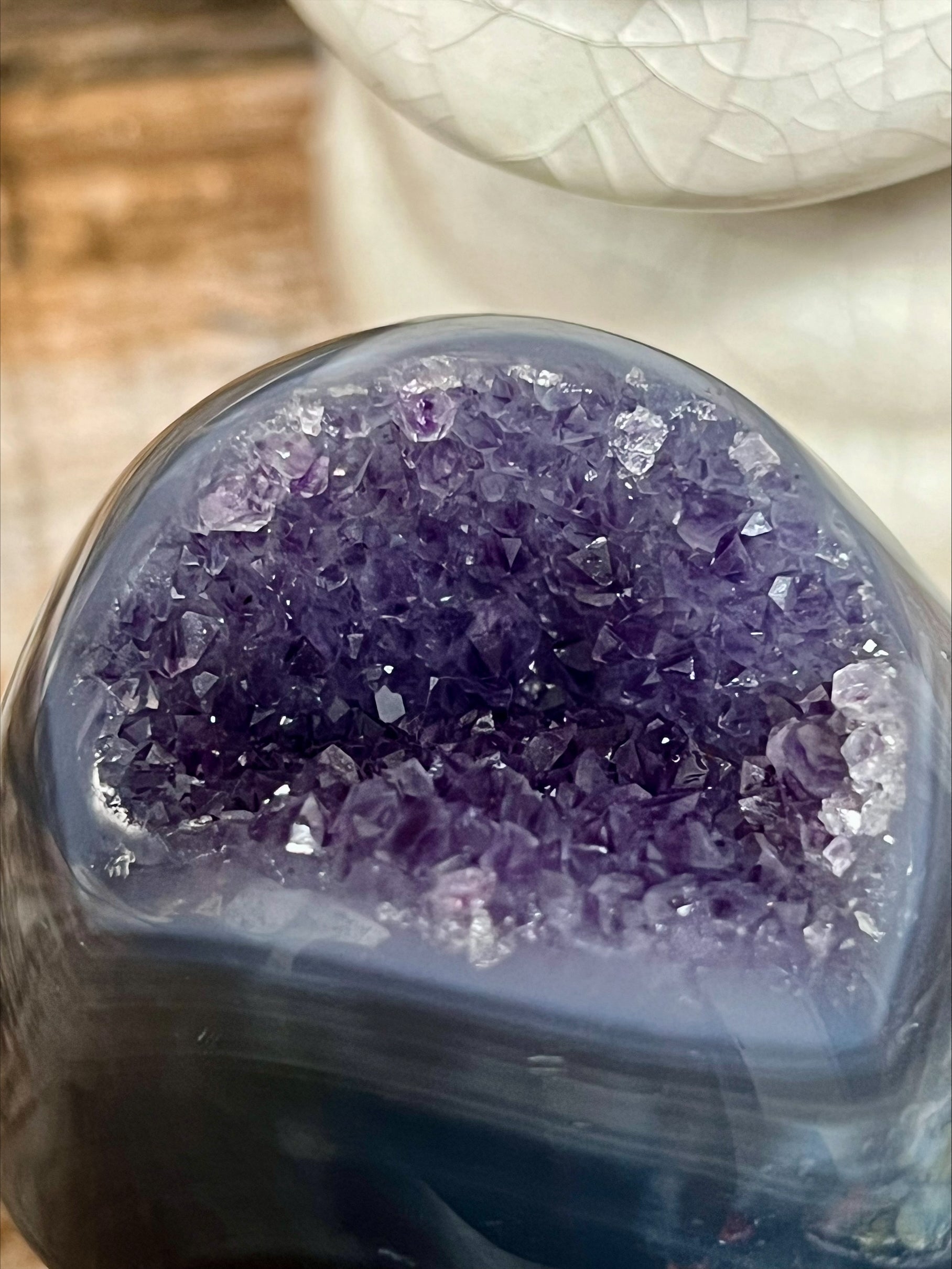 Amethyst helps in promoting good health on all fronts - physical, mental and spiritual. Physically, amethyst is known to bolster the immune system, reduce tension and headaches, and promote restful sleep. Mentally, its effects include alleviating worries and fears, encouraging clear thinking, and trusting one's intuition. Approximately 8.5cm by 6cm and 358g