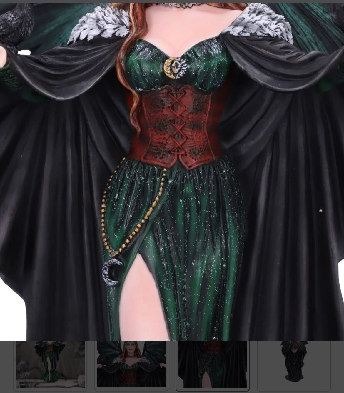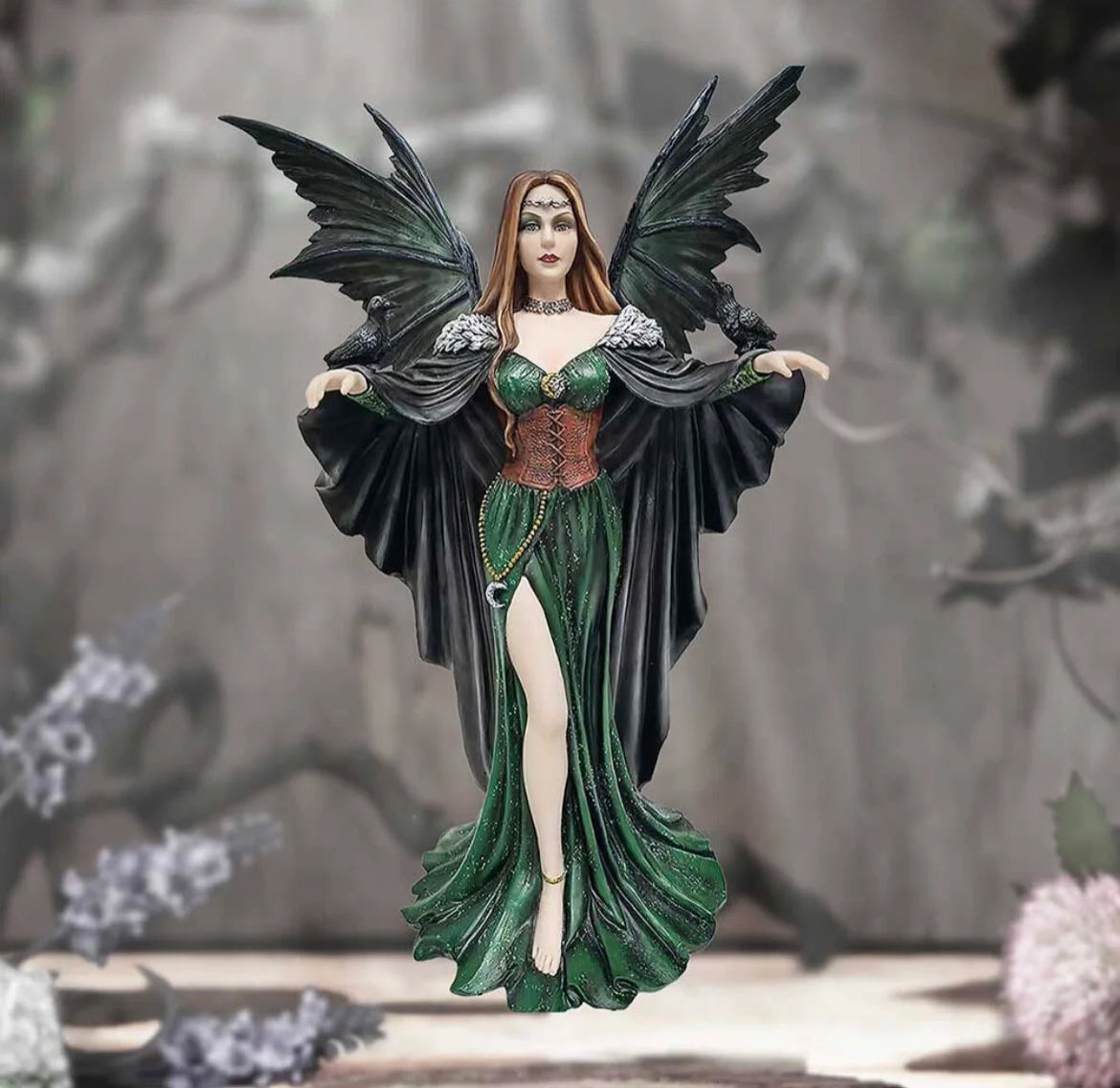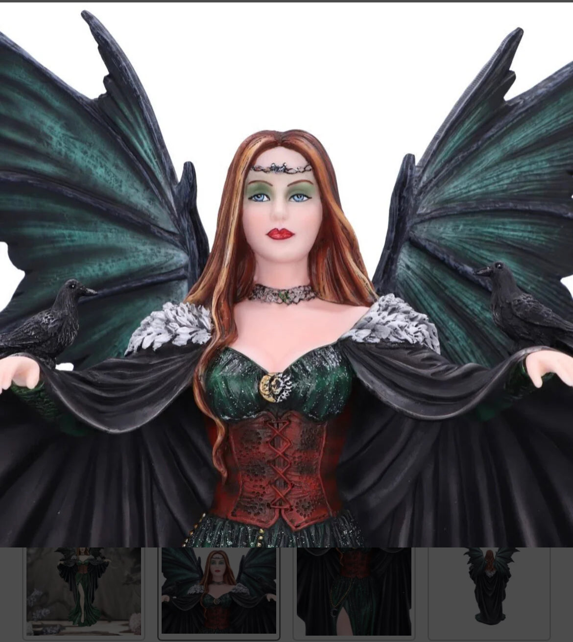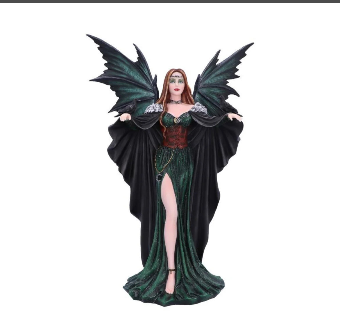 Behold the captivating Leila fairy statue, a mesmerizing blend of fantasy and elegance. This statue features a beautiful green fairy wearing a detailed corset, with her arms open and welcoming to raven companions perched atop them. Made from the highest quality resin and with the greatest attention to detail, this statue is a stunning addition to any space in your home. meadures 37.5cm