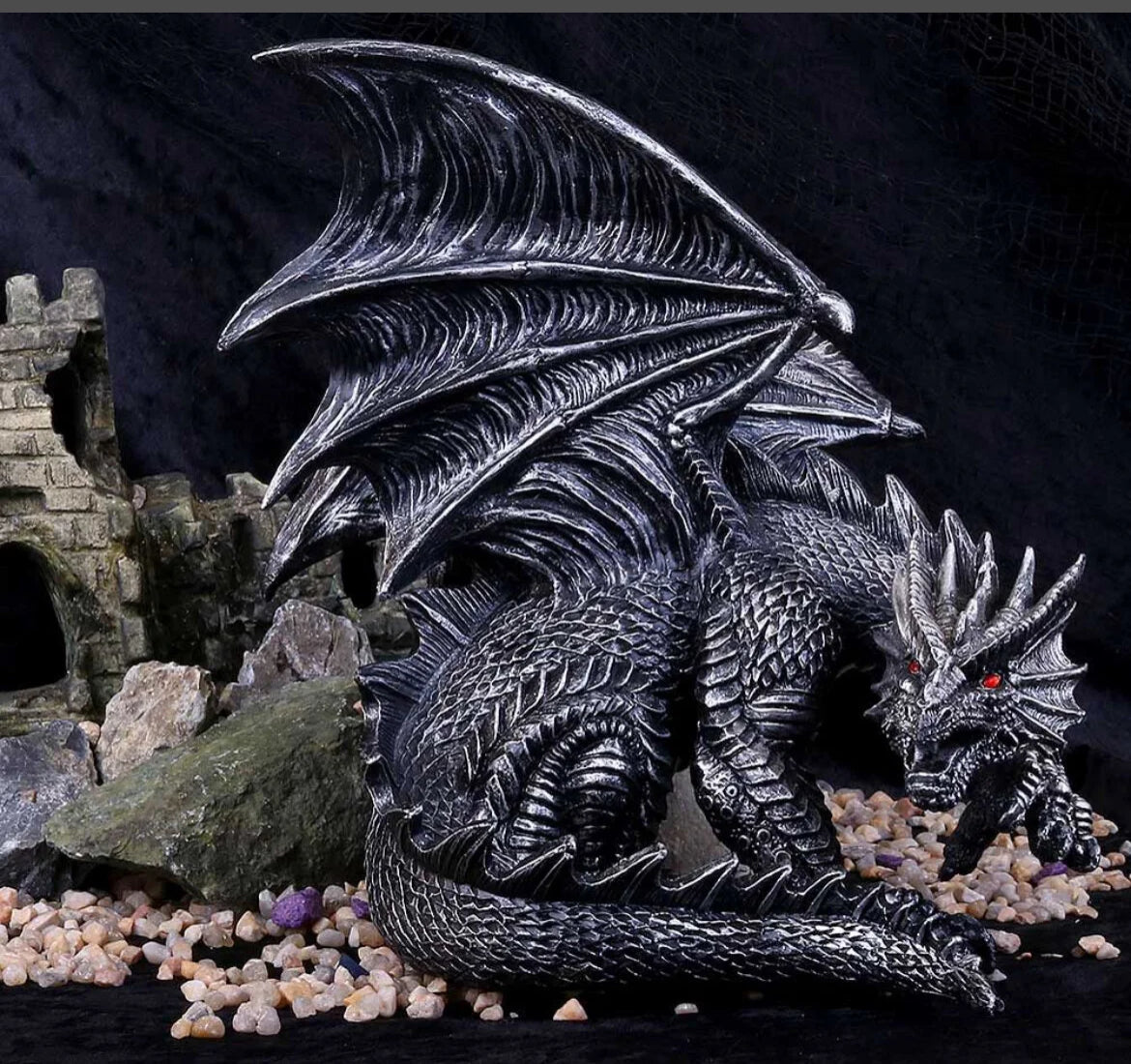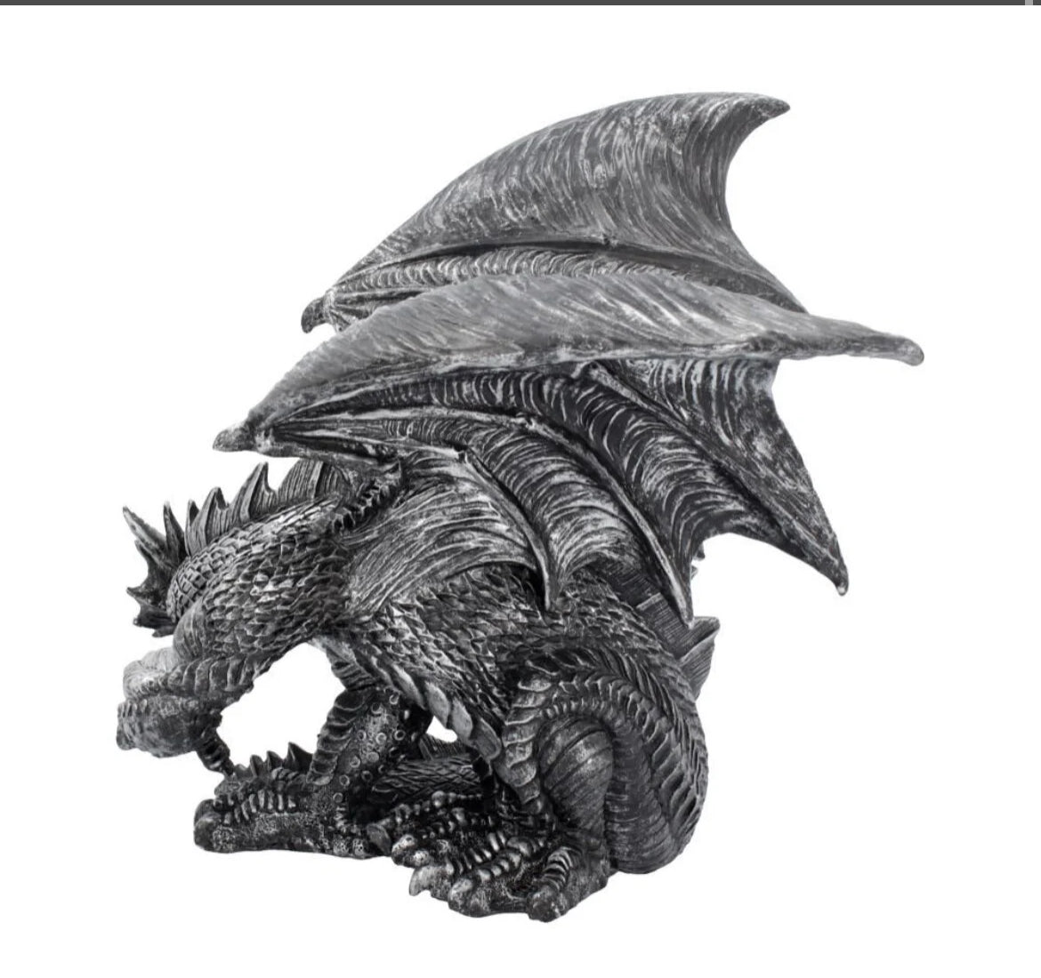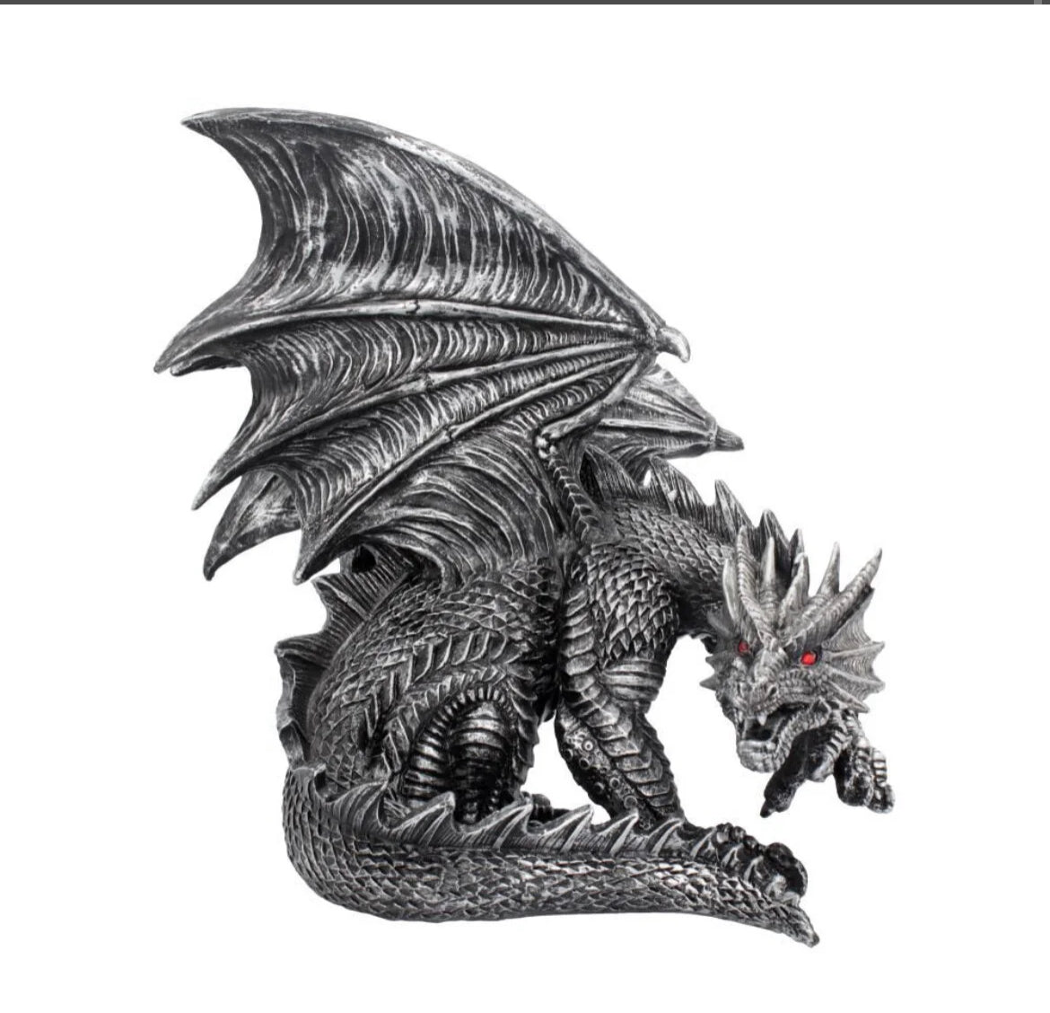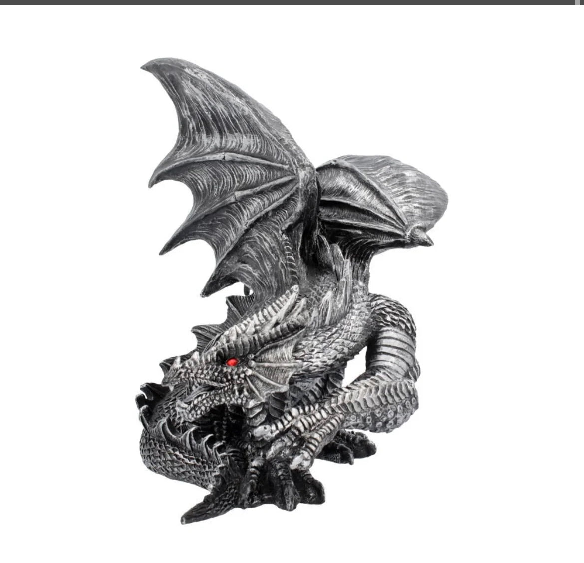 This Gothic Dragon was created by alternative brand Nemesis Now. This pewter-coloured beast sits, as if protecting his hoard. His head turned to the right side as his piercing red eyes lock onto his prey, while his wings are spread high above him. Cast in the finest resin before being painstakingly hand-painted, this Dragon is perfect for anyone who has a passion for mythical beasts. 25cm