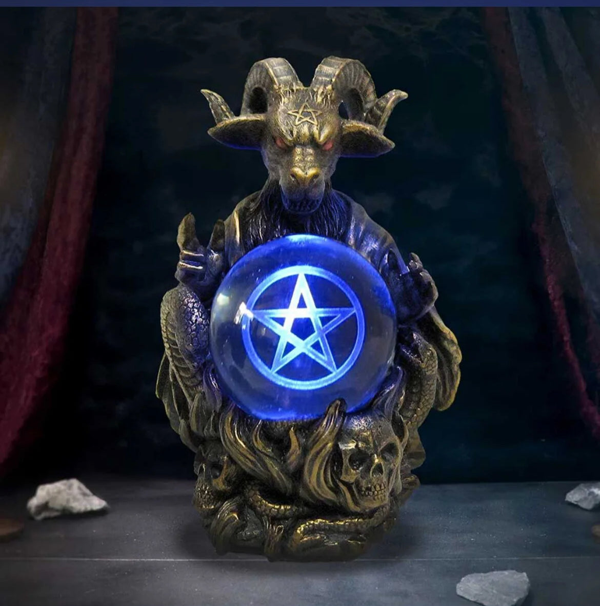 Delve into the occult with this memorising Orboculum of the Bathomet. Cast in the finest, this captivating piece features Bathomet draped in an unusual cloak, standing in an eerie stance as it gazes menacingly into a light blue orb (requires 2AA batteries). Within the orb, an image of Pentacle adds an unworldly dimension. , a chaotic array of demonic skulls, serpents, flames and occult symbology intensifies the mystical atmosphere. The piercing red eyed of Bathomet excludes an ominous allure, embodying the enigmatic nature of this dark diety.