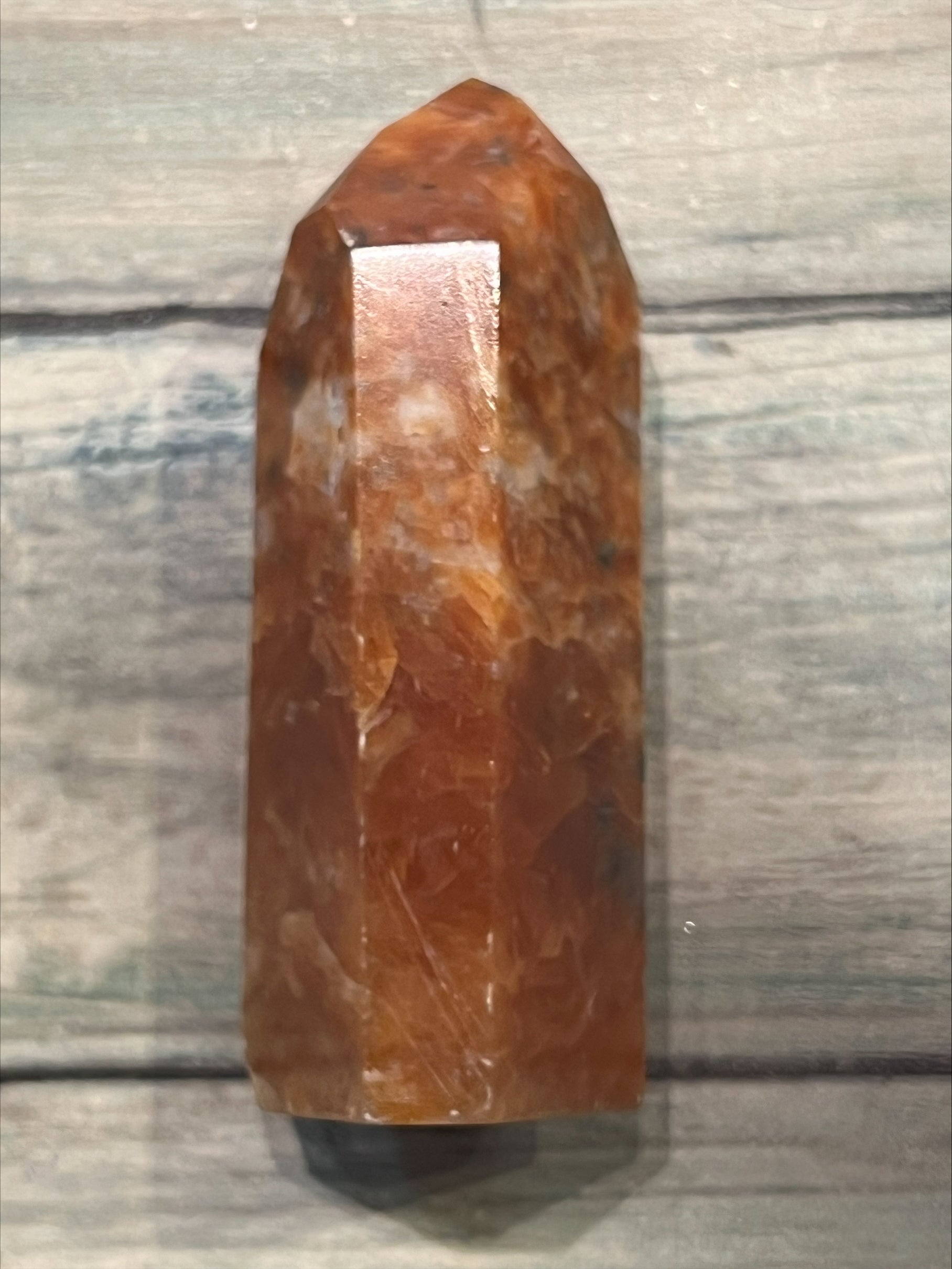 Orchid Calcite, a type of calcium carbonate mineral, is a relatively recent addition to the mineral world. It has quickly gained popularity for its striking orange and black coloration, a result of Black Tourmaline traces within it. As a creative stone, Orchid Calcite breathes life into your deepest, most passionate ideas. This vivid, blood-orange calcite variant is a powerful tool for manifesting desires and maintaining a path of enlightenment. The presence of Black Tourmaline in Orchid Calcite adds a layer of protection, enveloping your aura and physical energy. This makes it an ideal companion for exploring your most creative ideas without the fear of failure or judgment from others. Orchid Calcite serves as a reminder of the importance of following your spirit and staying true to your life's path. Approximately 3cm by 3cm by 8cm and weight 126g