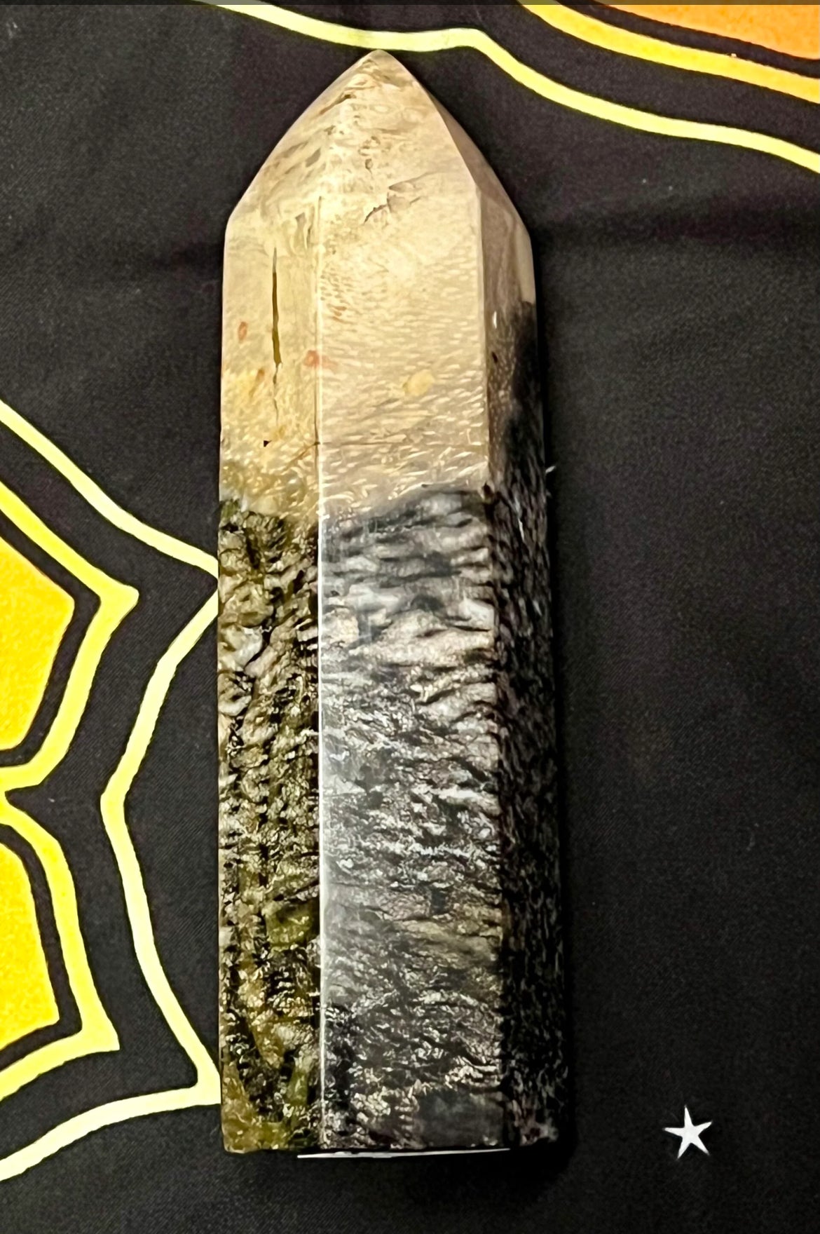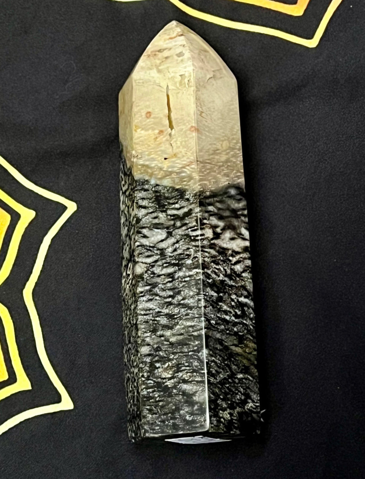 Palm root is a miracle of elemental alchemy, holding potent earth medicine within it. When the palm roots of ancient mystical Indonesian palm trees sunk into the our earth mother millions of years ago, the Silica carried in underground water combined with intense pressure, caused the pseudomorphic process of wood being replaced by microcrystalline Quartz, largely Chalcedony and Jasper. This palm root tower holds within it all elements; the earth it birthed from and returned to, the Light and heat of our fiery sun and the air it photosynthesised during its time as a tree, and the water element that caused it to adapt and transform its inner structure over centuries. Palm root is also extremely helpful in;
