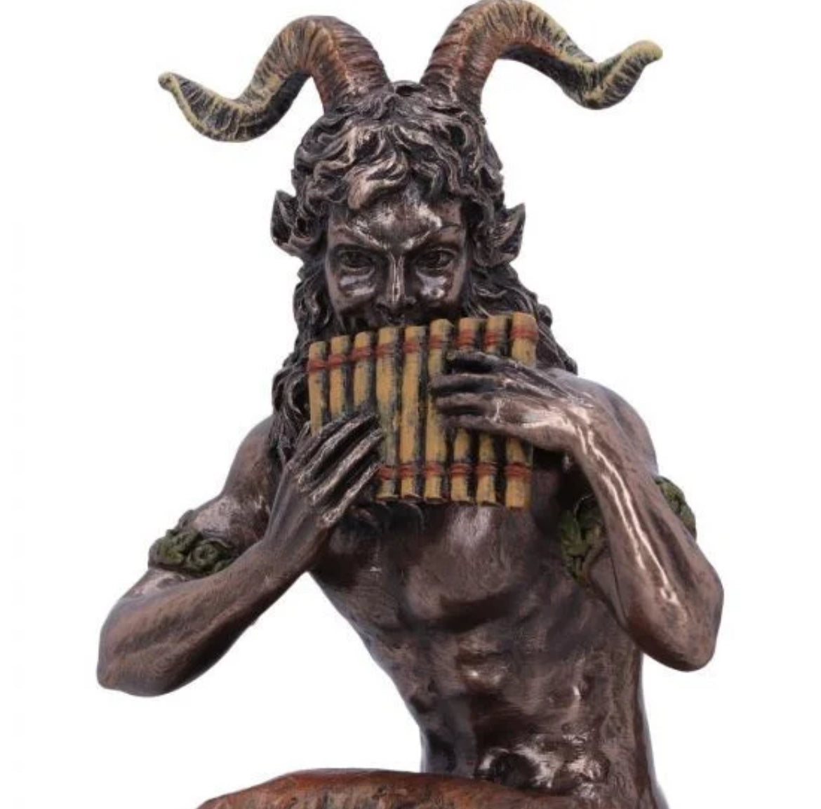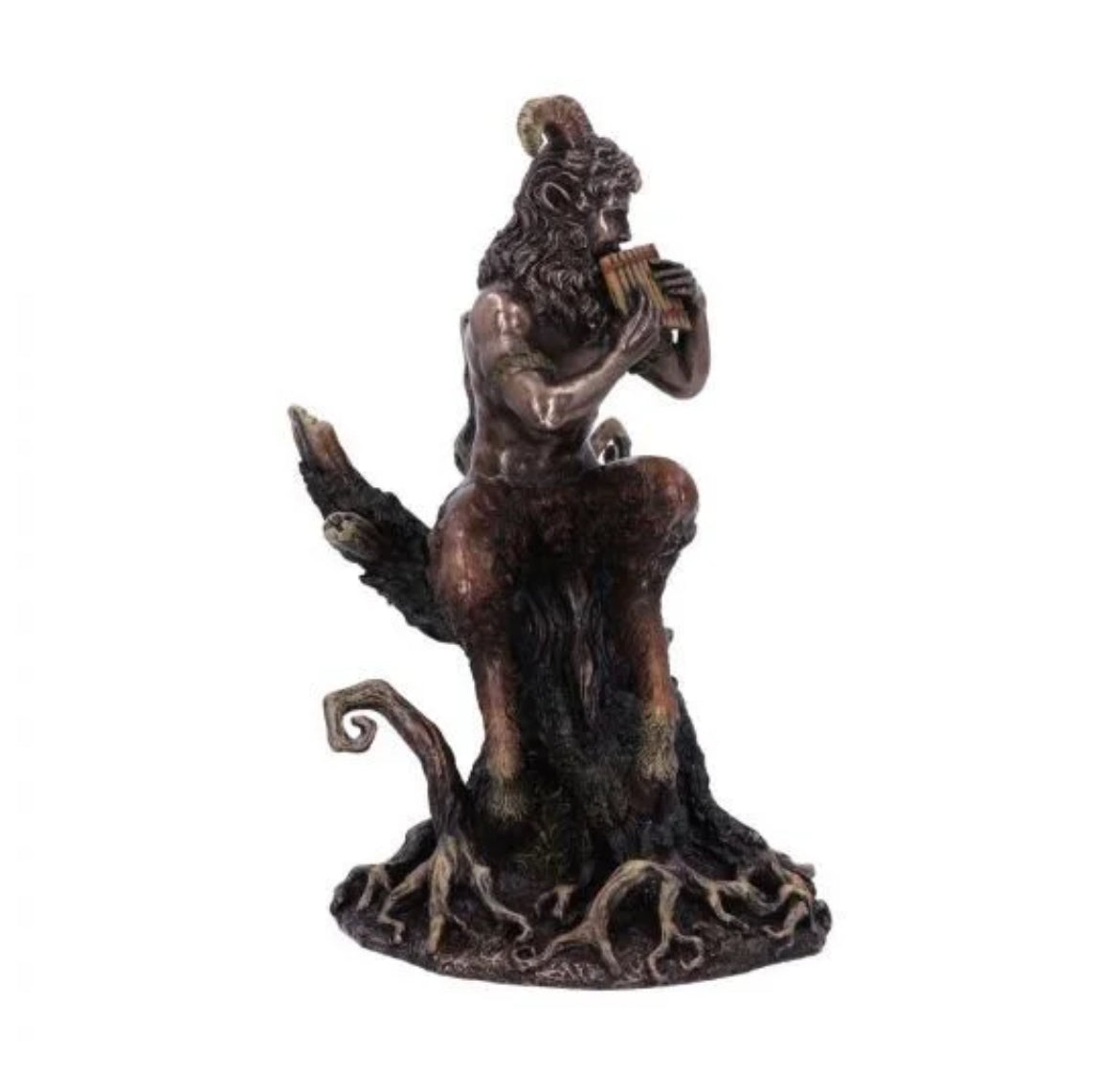 Pan, God of the wild, of mountains and rustic music and companion of the nymphs. Pan has the body and torso of a human, yet the hindquarters, legs and curved horns of a goat. Sat on a curled tree trunk, he is seen playing a rustic melody on his symbolic Pan flute. He is cast in the finest resin, before being given a bronzed finish.