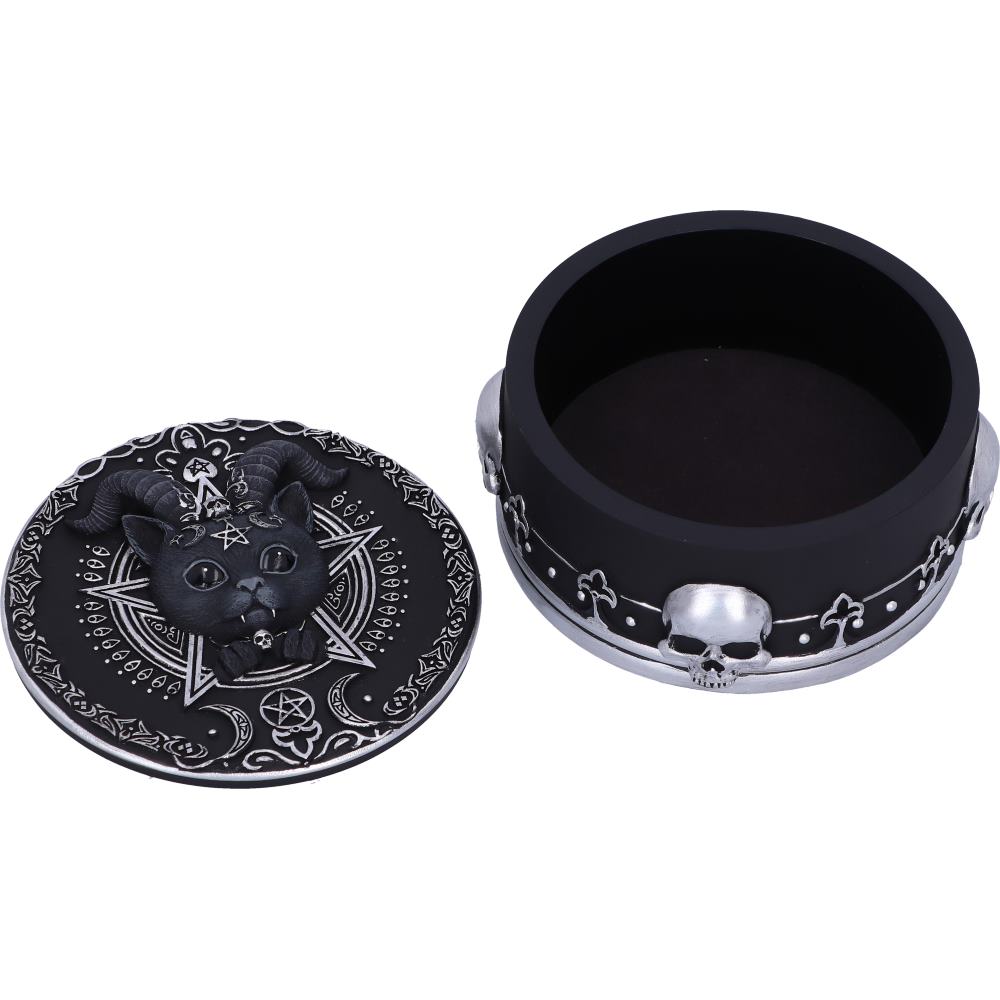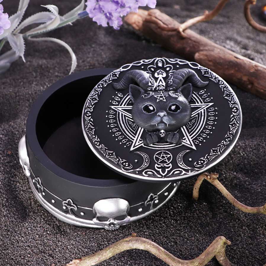 From the bewitching mind of our in house design team comes this Pawzuph Trinket Box. Pawzuph the union of good and evil features on the lid of the trinket box staring up at you adoringly. As you look into their black eyes you notice the darkness that resides within. The trinket box is decorated in ornate silver detailing and satanic symbology and is cast in the finest resin before being expertly hand-painted. This trinket box is perfect for any gothic lover or collector of Nemesis Now's Cult Cuties range.