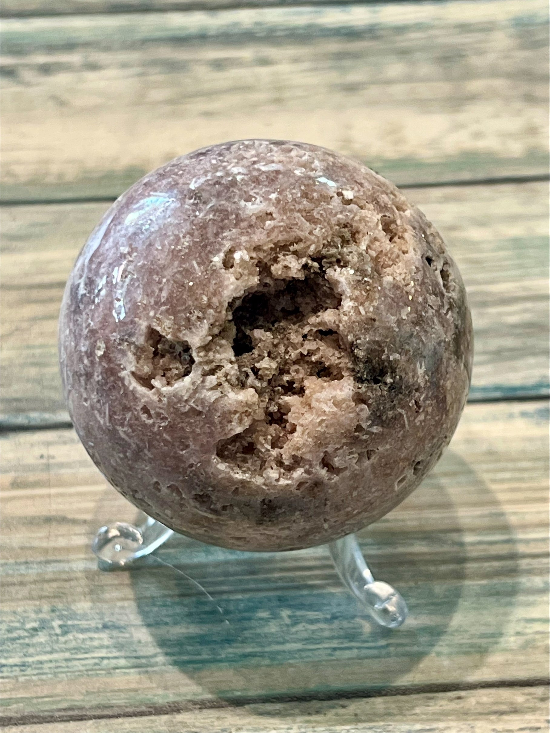 Pink Amethyst opens the heart chakra for giving and receiving love and friendships. The crystal promotes a positive self-image, body image, self-esteem, self-love and empowerment. The stone connects the heart and crown chakra to encourage your life to be spiritual. Approximately 6.6cm diameter and 284g