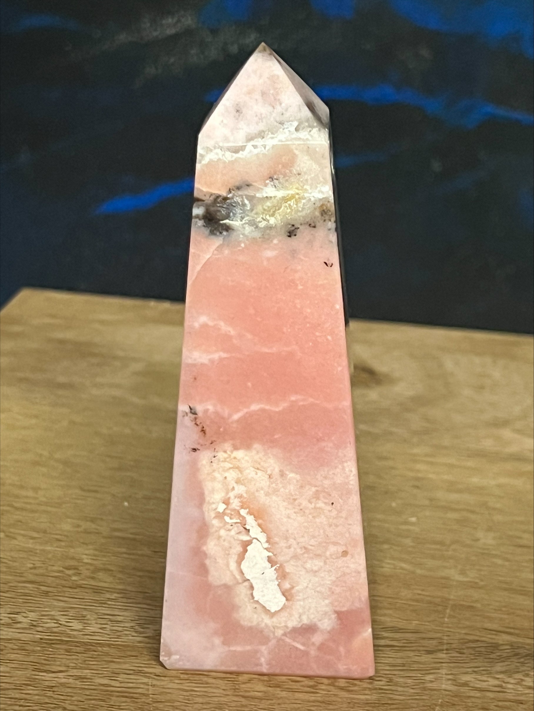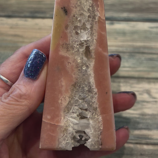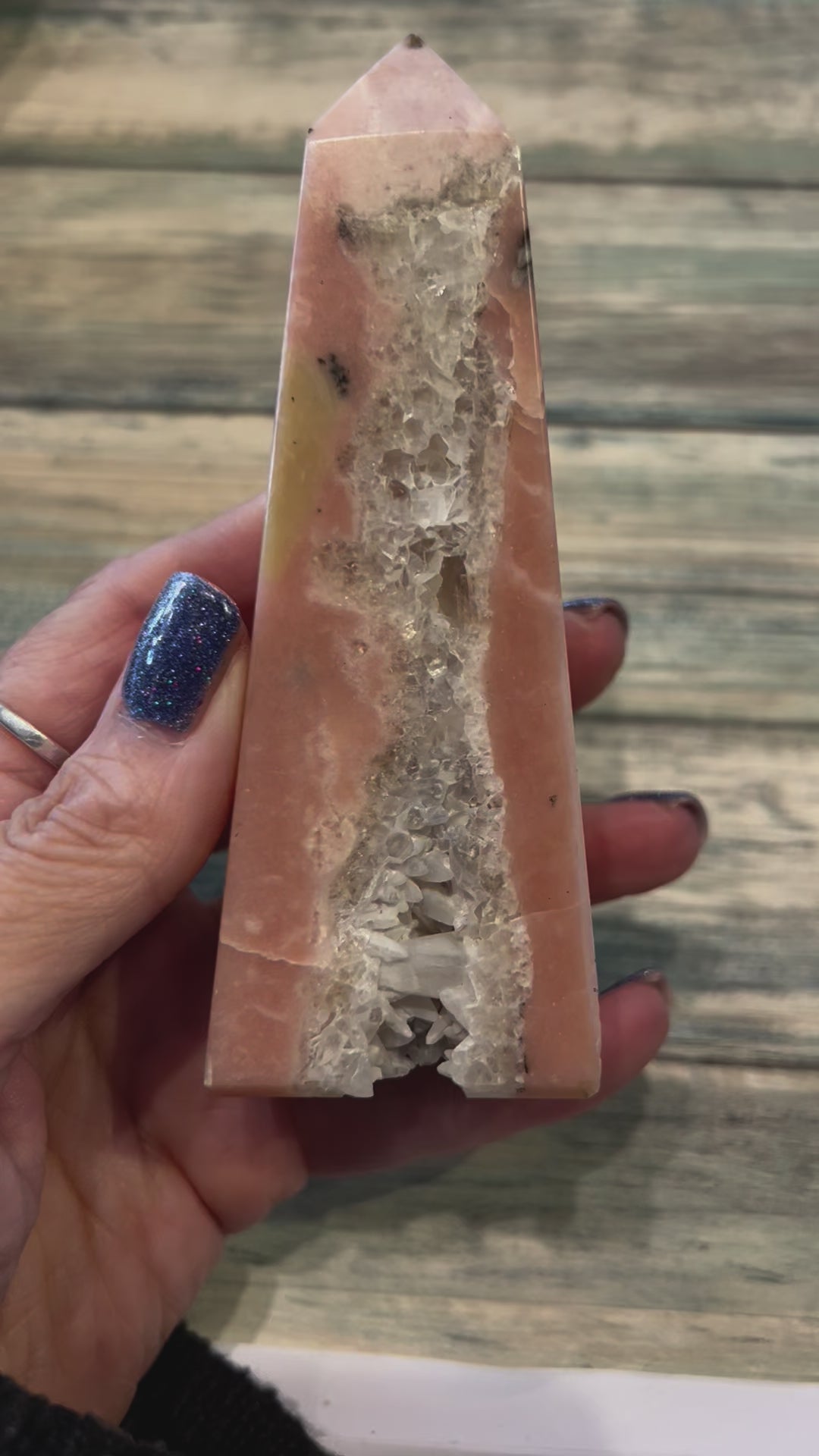 A stunning druzy, pink opal tower. Pink opal is often associated with love, gentleness, healing, and emotional balance, promoting a sense of peace and tranquility. It's also seen as a stone of resolution, helping to forgive past mistakes and look towards the future. Approximately 4cm by 4cm base, height 11.5cm and weight 230g