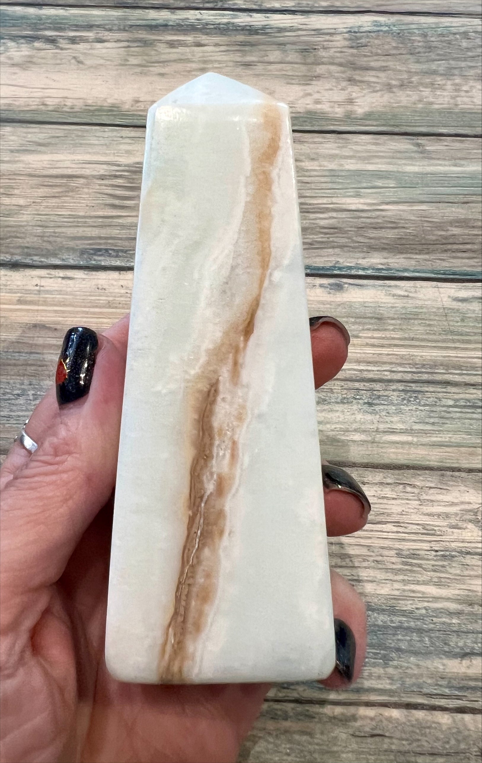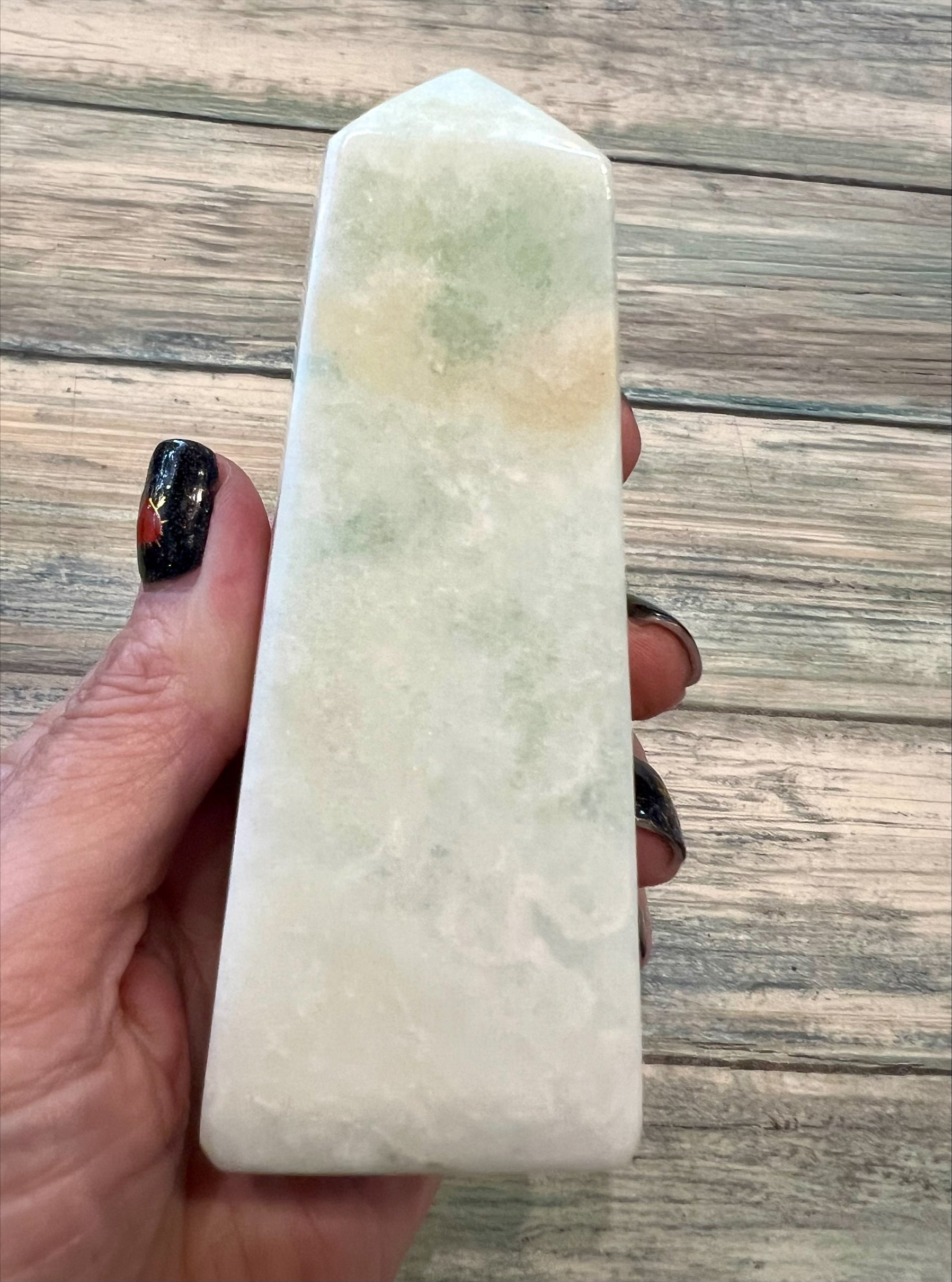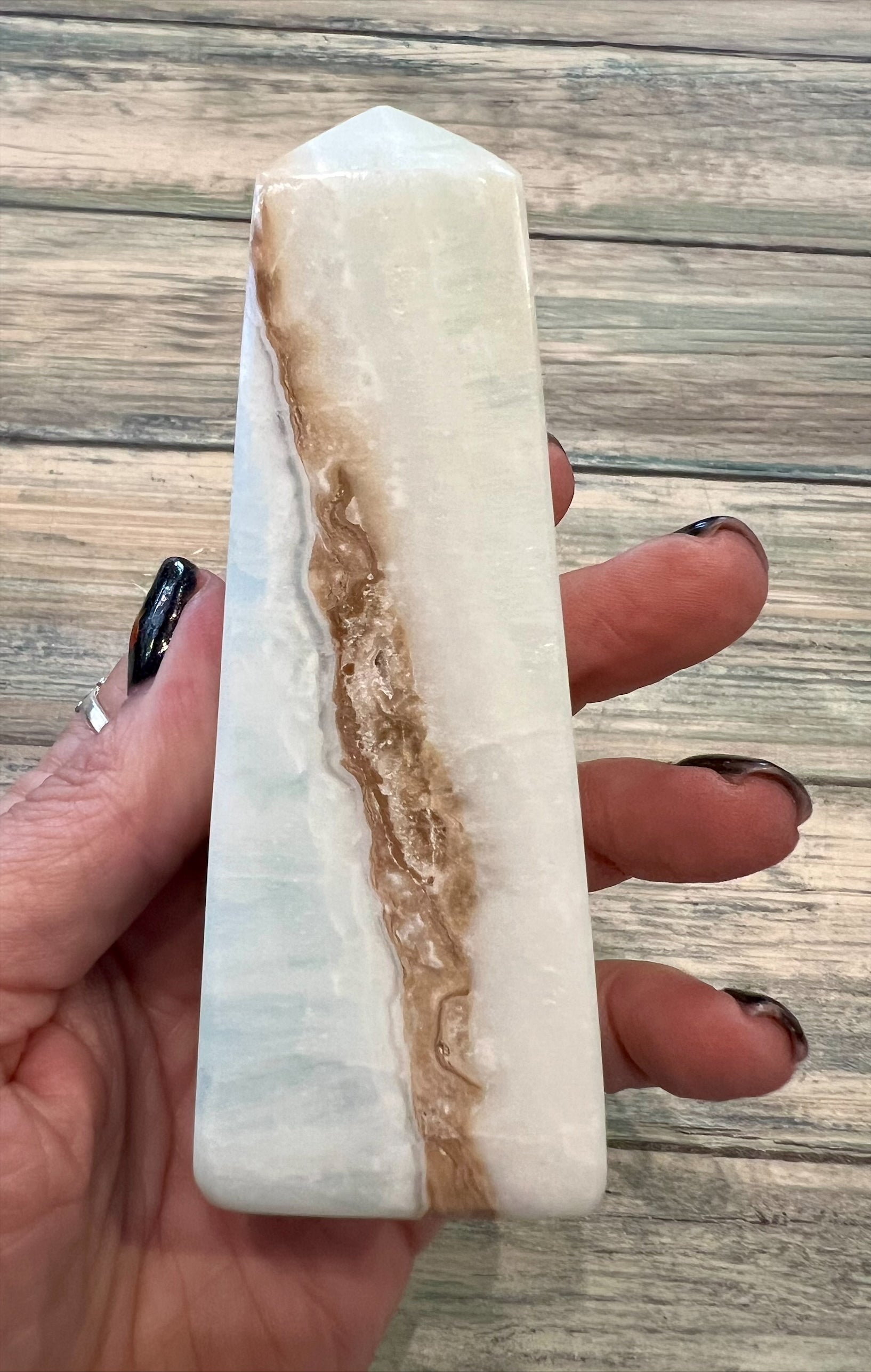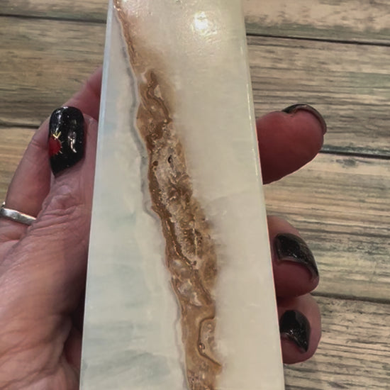 A calming stone, Caribbean Calcite encourages us to live in the present moment. It offers Relief from stress and anxiety and promotes restful sleep and lucid dreaming. Caribbean Calcite opens, activates, and heals the Crown and Third Eye Chakras. Measures approximately 11cm height and base 4cm x 3.5cm