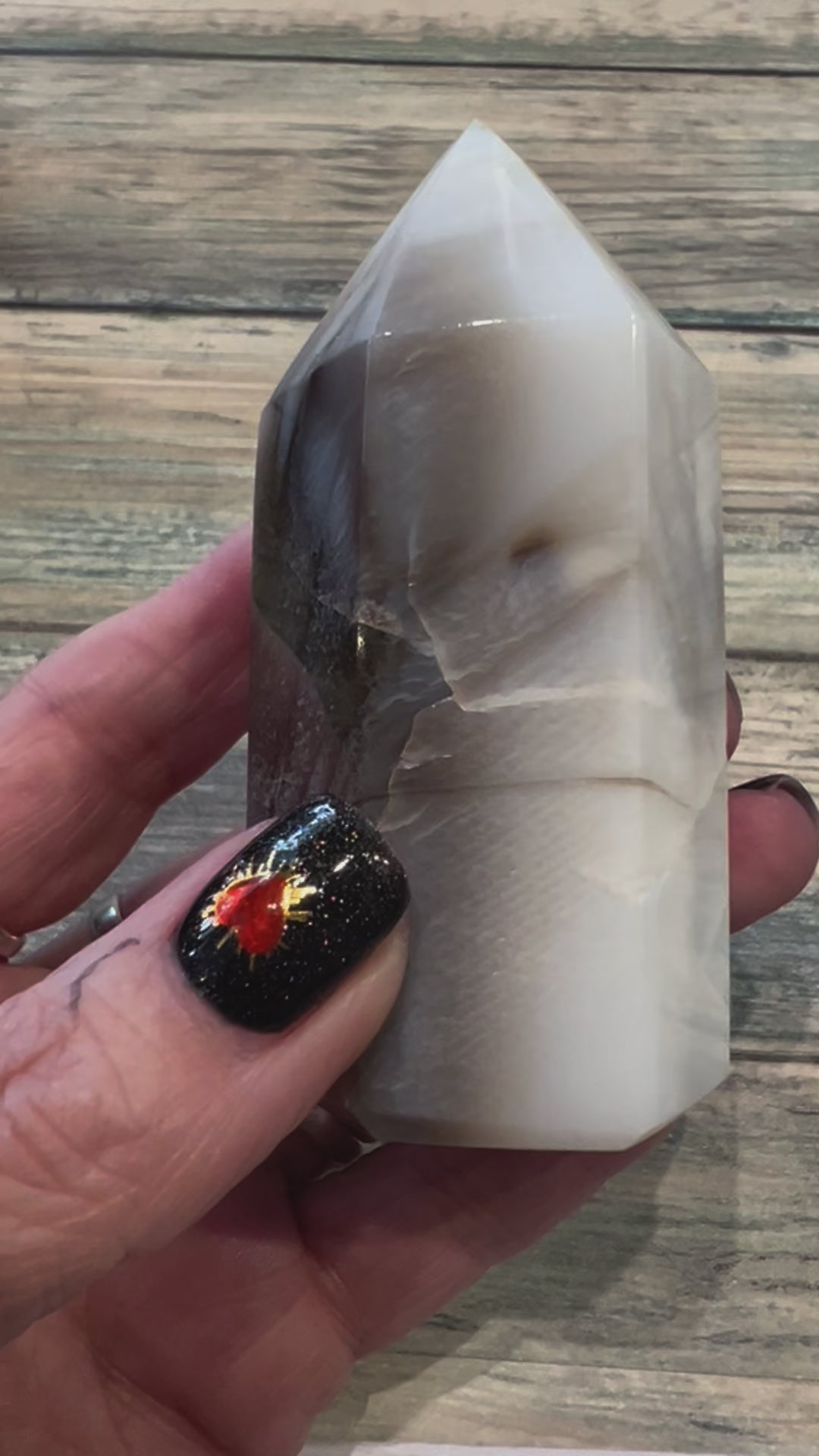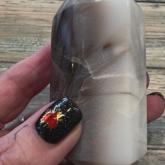 It picks up thoughts and feelings, amplifies them, and returns them to the source. It enhances self-worth and helps in understanding your full potential. It brings lightness and spontaneity. Opal Agate aids in centering and stabilizing physical energy and gently facilitates acceptance of one's self. Approximately 9cm height. Base 3.5cm by 4cm