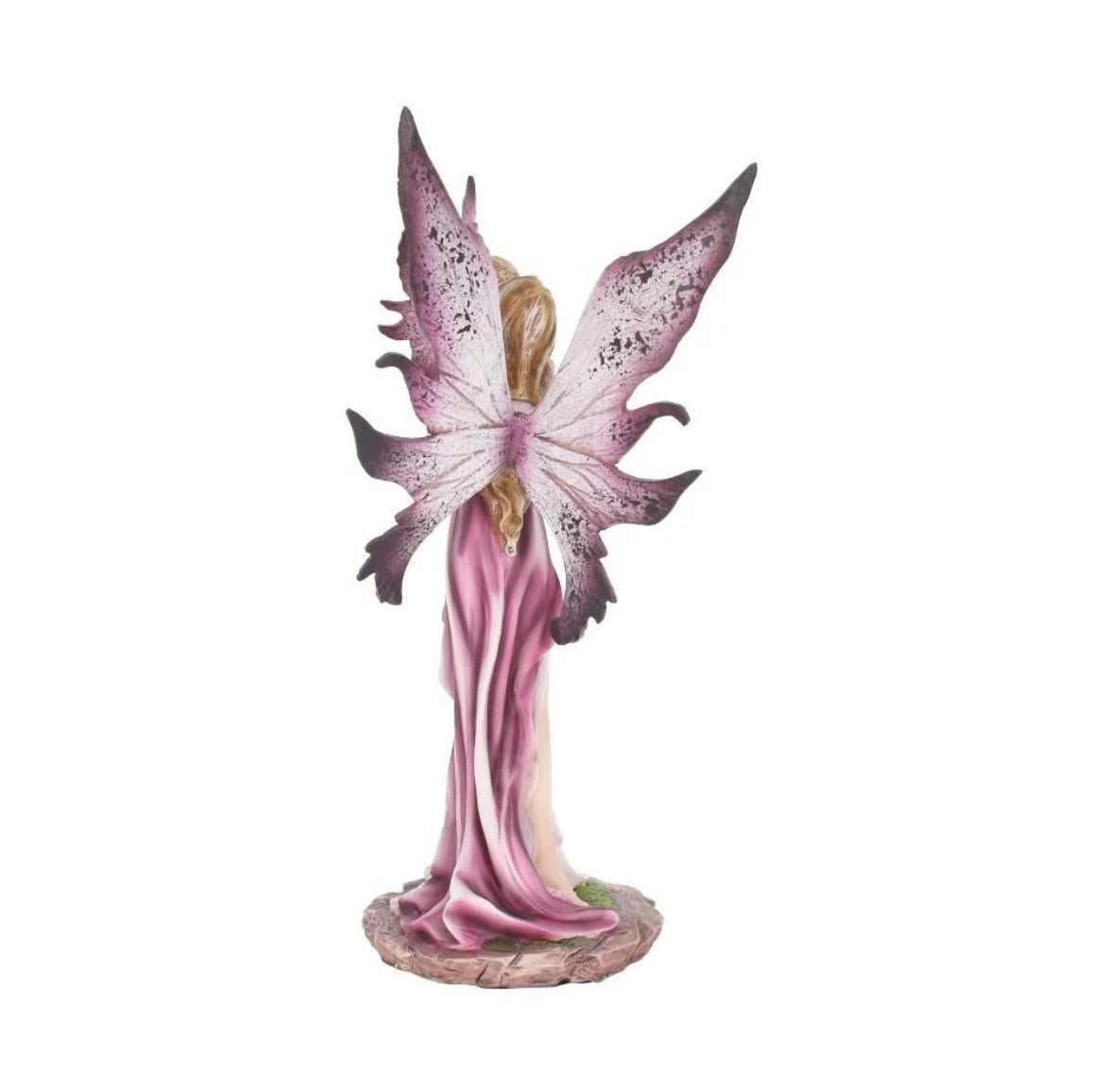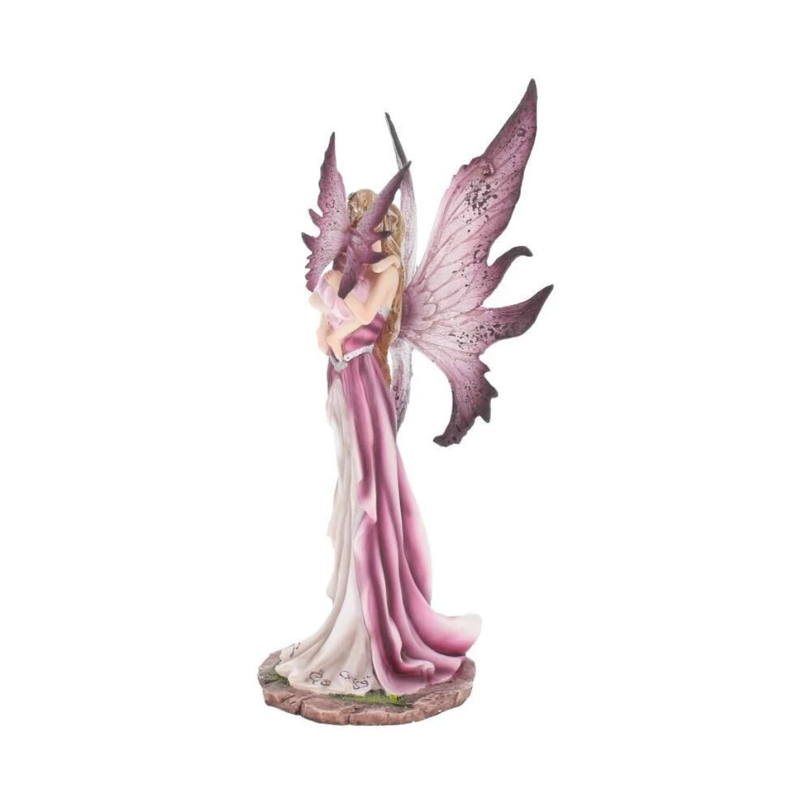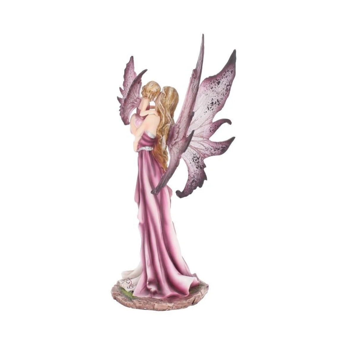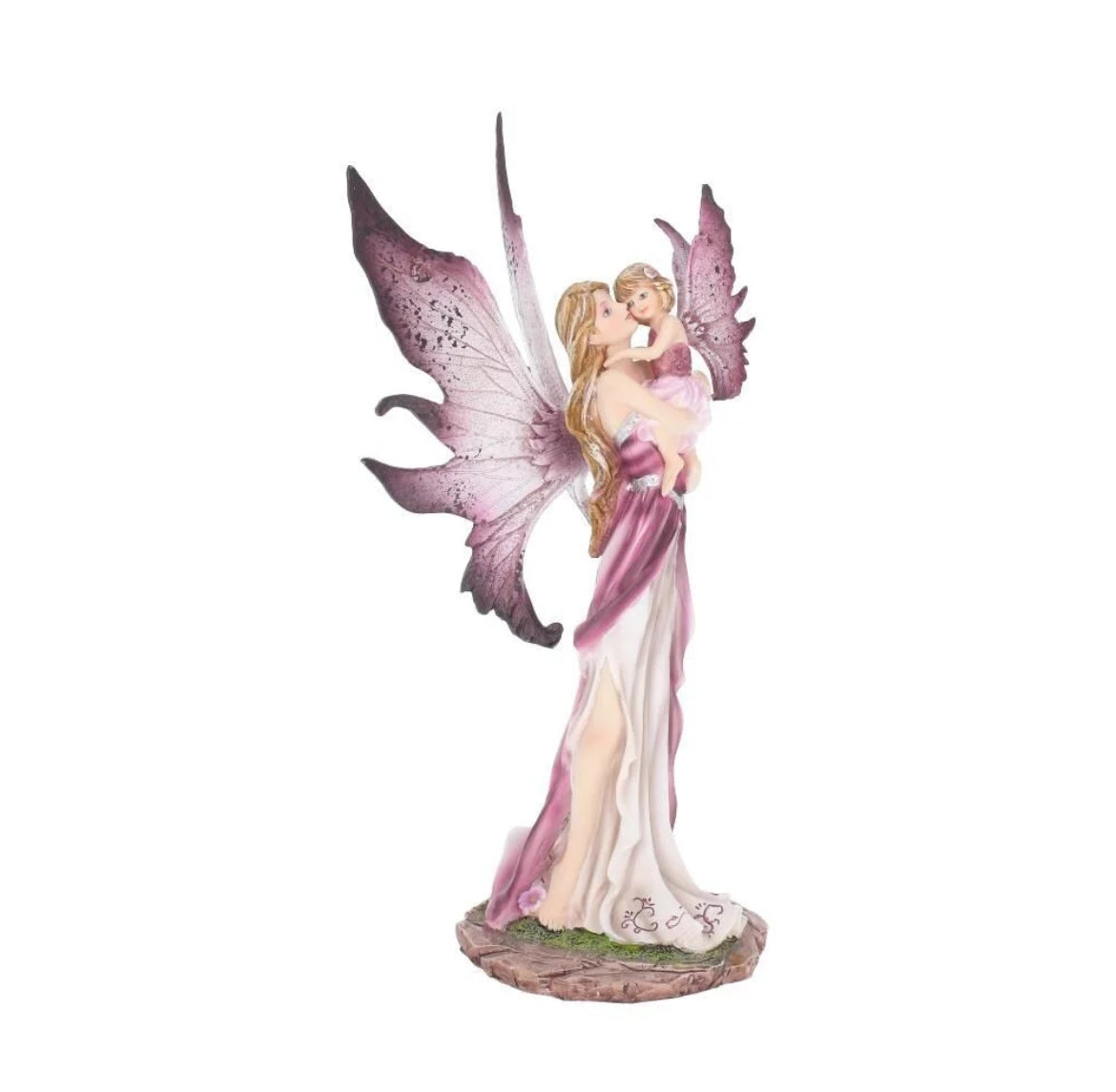Standing on the ground, this fairy matriach cradles her small fae child to her face. Both wearing flowing fuschia dresses, they make the most adorable pair. The mother's light hair flows over her tiny frame, while her large purple ombre wings take centre stage. Cast in the finest resin and pain-stakingly hand painted, this figurine is for anyone who wishes for a little magic in thie rlife.