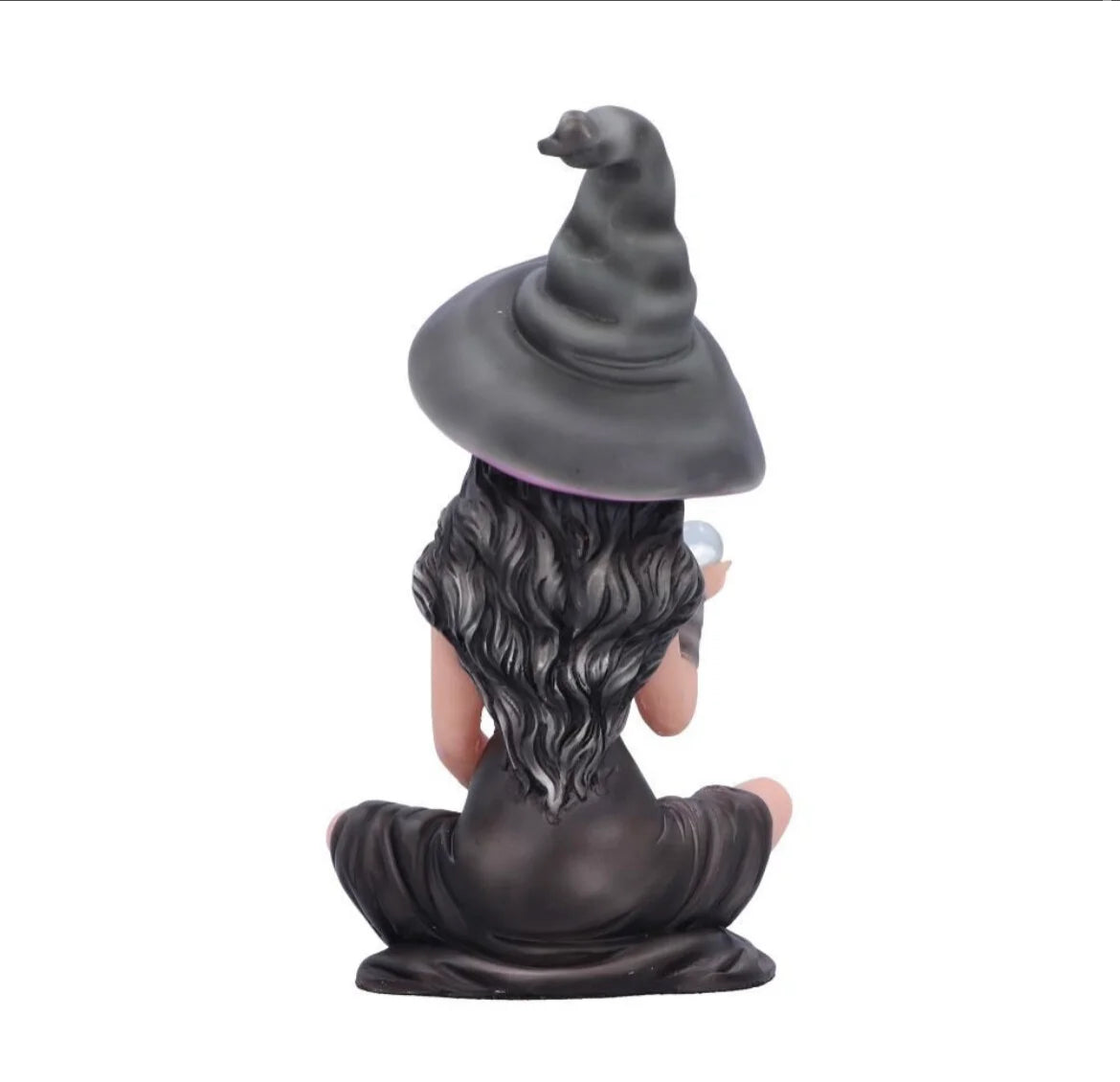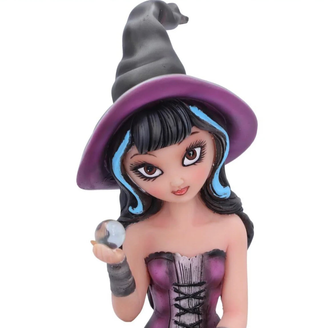 Prudence sis crossed legged with her crystal ball held in one hand and stick in the other as she stirs her magic potion. Dressed in a black and purple witches hat, corset and skirt and lace up leather boots, she eagerly awaits the magic that is about to begin. Cast in the finest resin, before being expertly hand painted, this cute little witch will make the perfect addition to any lover of fantasy or witchcraft
