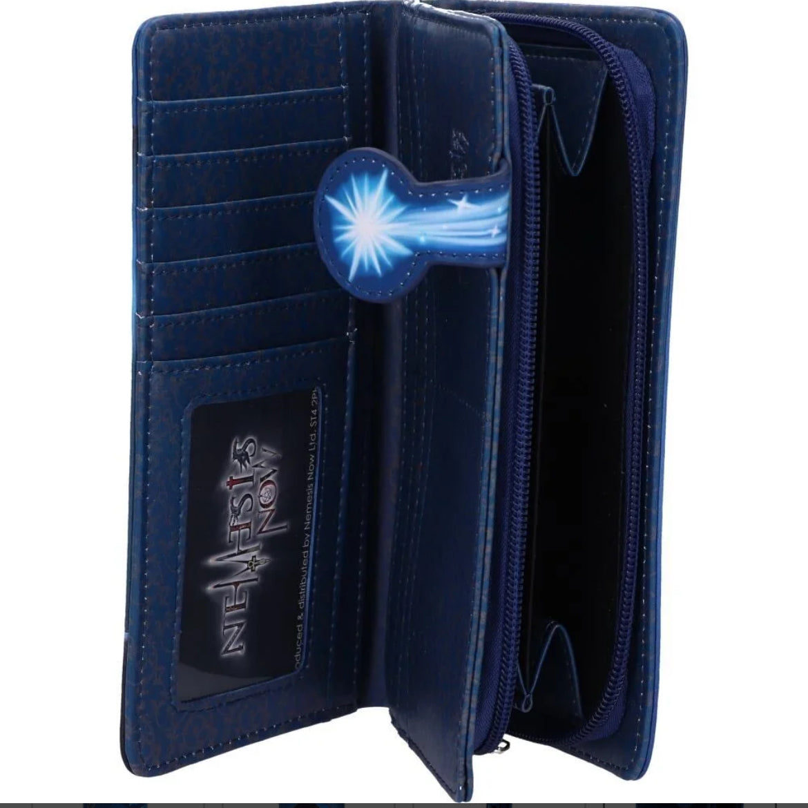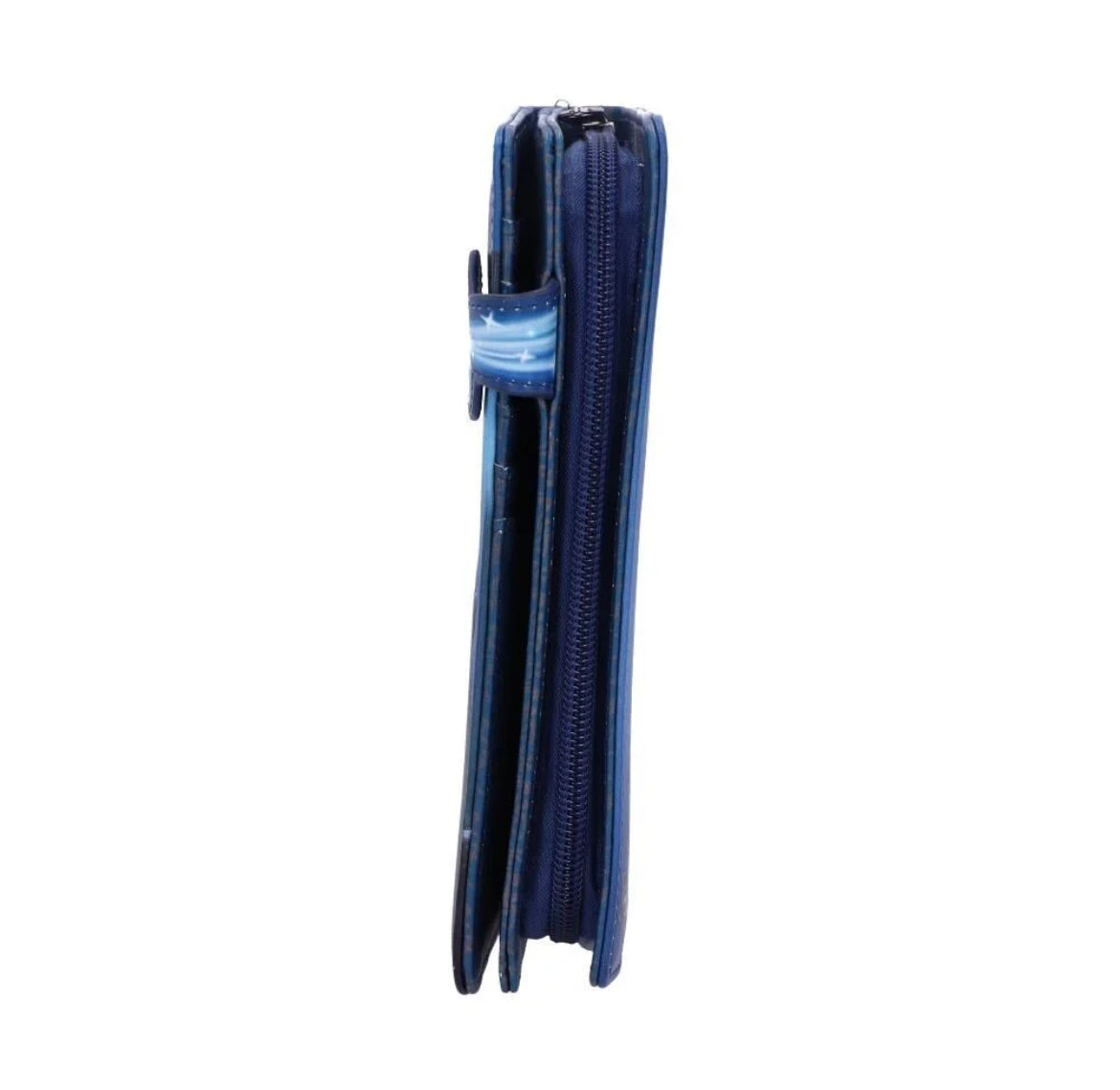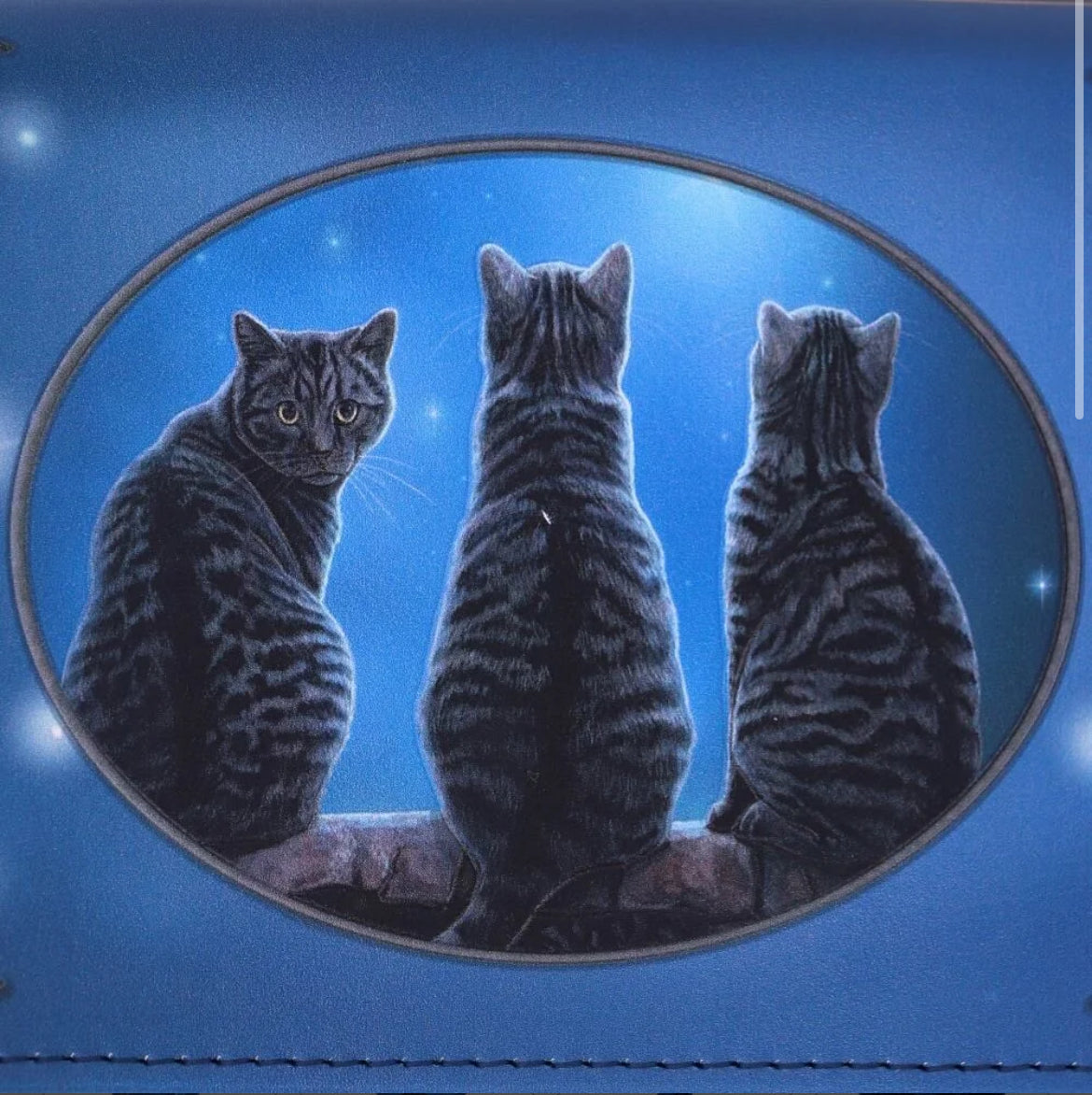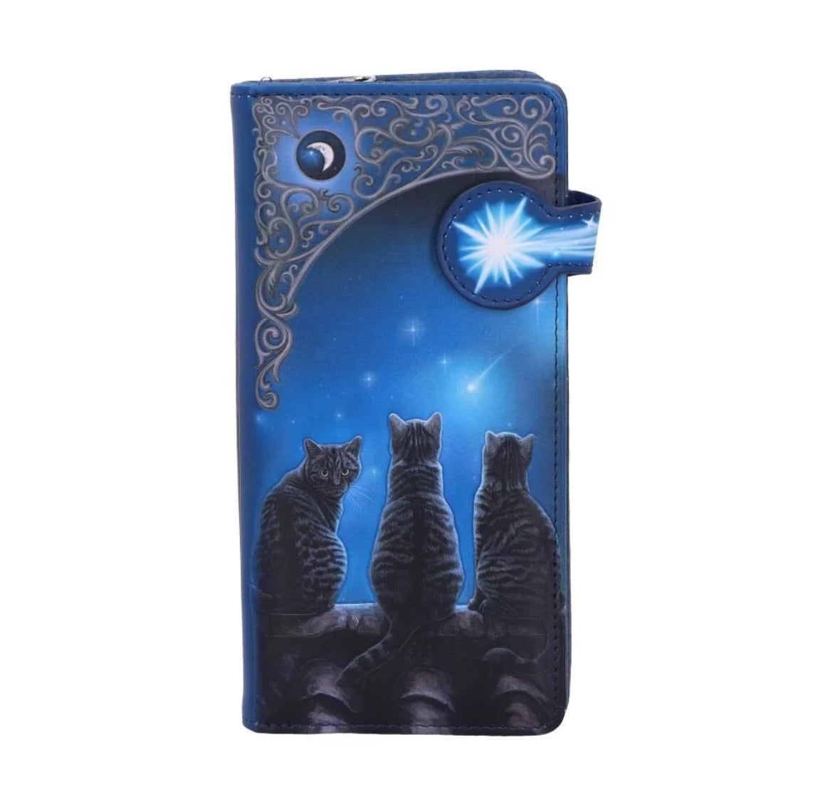 This embossed purse is endorsed with the stunning Wish Upon a Star artwork by Lisa Parker. Three cats sit side-by-side on the wall, their backs turned to you as they stare up at the night sky. A single shooting star courses across the firmament, whilst the left most cat turns to look at you, as if wishing to make a wish with you. This purse is both stylish and spacious with multiple slots for cards and a zip compartment for coins. With an easy press stud closing, this beautifully purse measuring 18,5cm, will be admired by many whilst you shop.