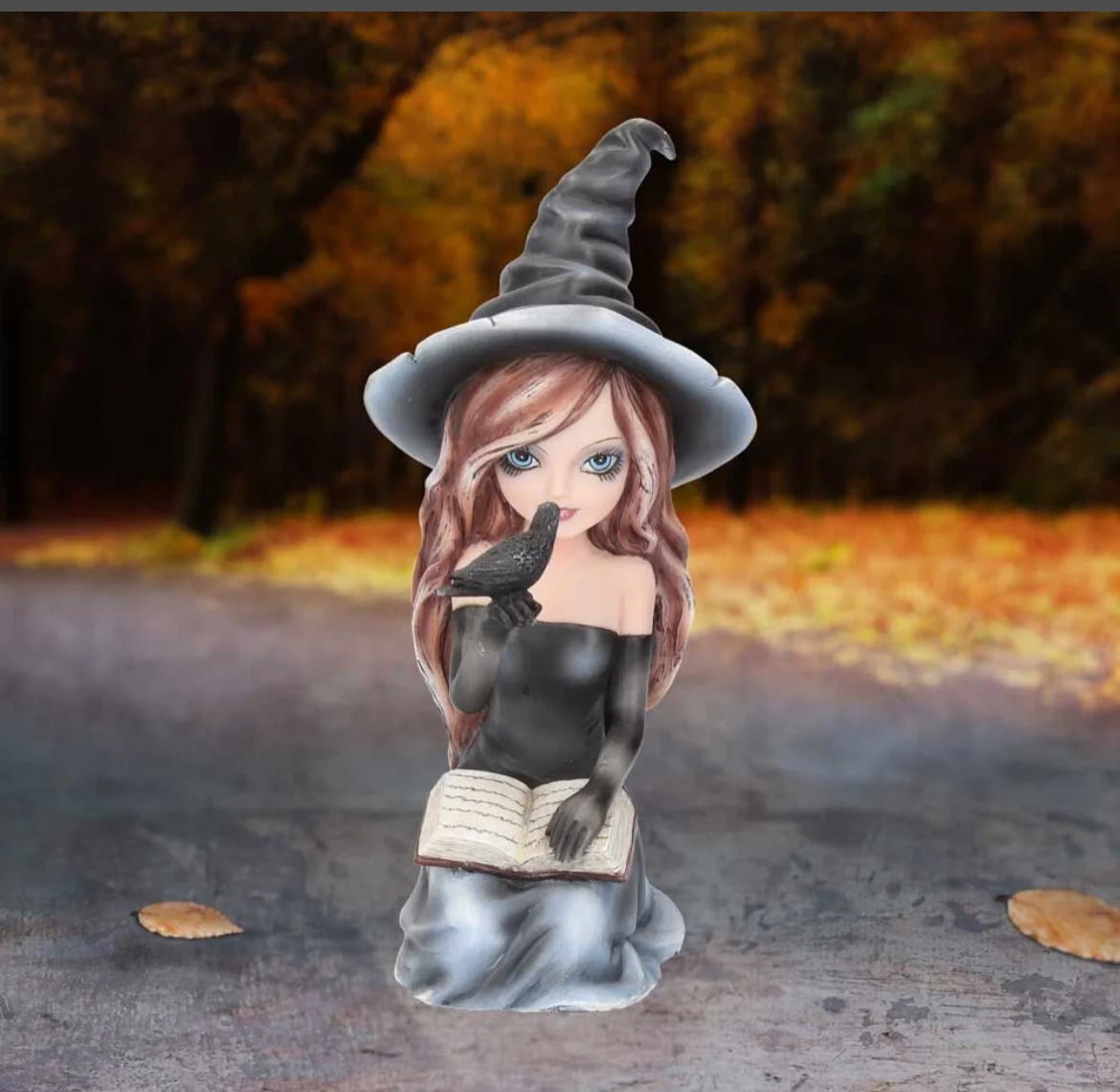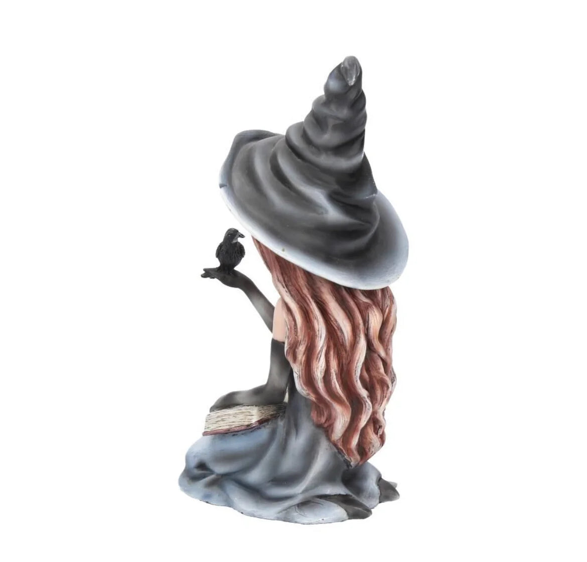 Cast in the finest resin before being expertly hand-painted, this small witch figurine comes from alternative brand Nemesis Now's giftware collection. Wearing a tonal grey dress and matching pointed hat, Regan kneels on the ground cradling her grimoire with her left hand as her right become the perch for her raven familiar. Her face is heavily made up and is beautifully framed by her auburn hair, detailed with platinum highlights. The perfect gift for your witchy pals!